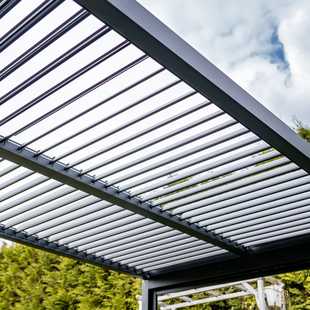 A 3 x 3 méteres kerti pergola egy modern megoldás a szabadtéri pihenéshez. Elhelyezhető a teraszon, közvetlenül a ház mellett, így teljes terasztetőt alkotva, de akár önálló építményként is a kertben. A nyitható tető lehetővé teszi a bejutó fény mennyiségének beállítását. A tető hatékonyan véd a túlzott napsütéstől, de a nyári enyhe esőtől is. A kerti pergolát modern és egyben minimalista dizájnja jellemzi, amely illeszkedik a szabadtéri rekreációs területek legdivatosabb elrendezéseihez. A terasz tetőfedése időjárástól függetlenül használhatóvá teszi a pihenőhelyet.