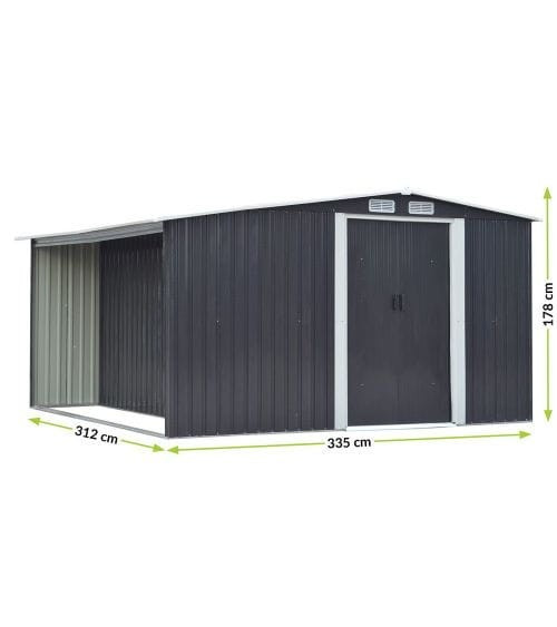 A horganyzott acélból készült kerti ház kültéri használatra tökéletes szerkezet. Ezt az anyagot fokozott nedvesség- és korrózióállóság jellemzi, így a ház tovább tart. A tolóajtók nem foglalnak több helyet, ráadásul nagyon praktikusak és kényelmesen használhatók . A szellőzőnyílásoknak köszönhetően a belső levegő állandó keringése biztosított. A fatároló rekesz hatékonyan védi a faanyagot az esőtől.