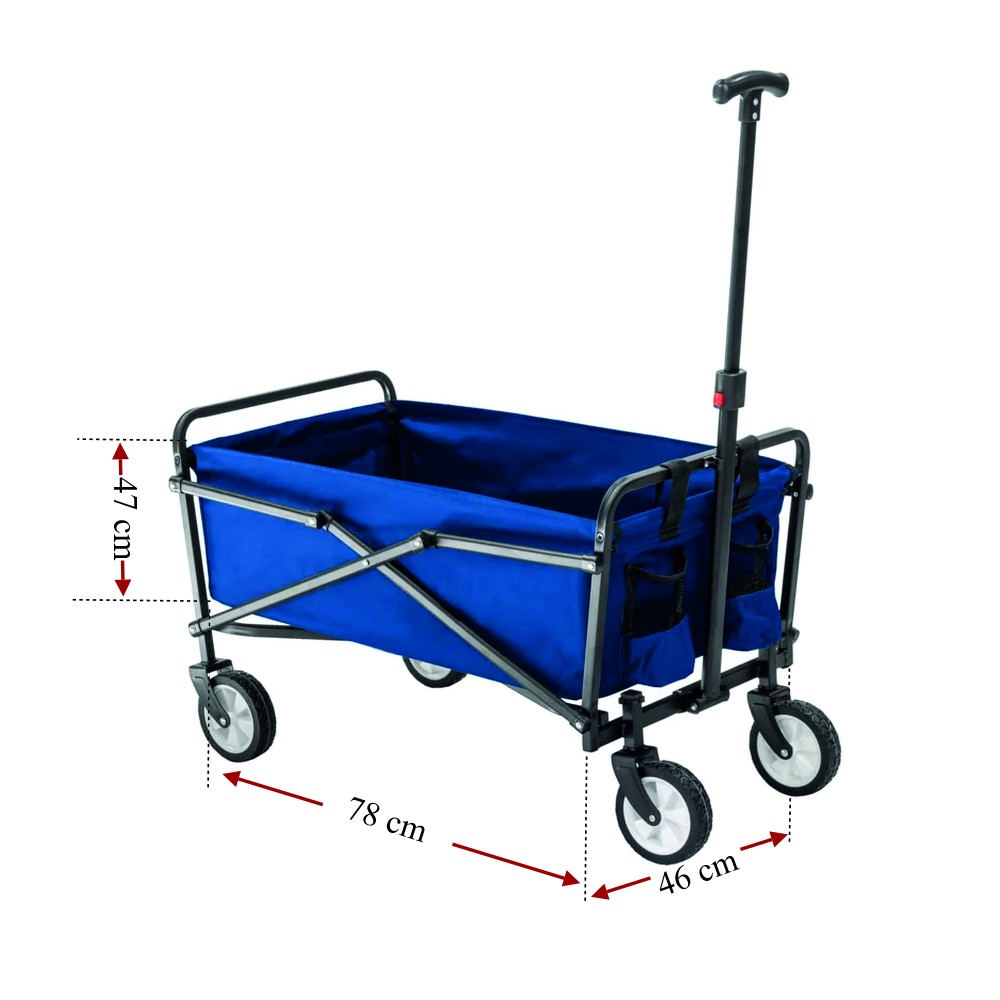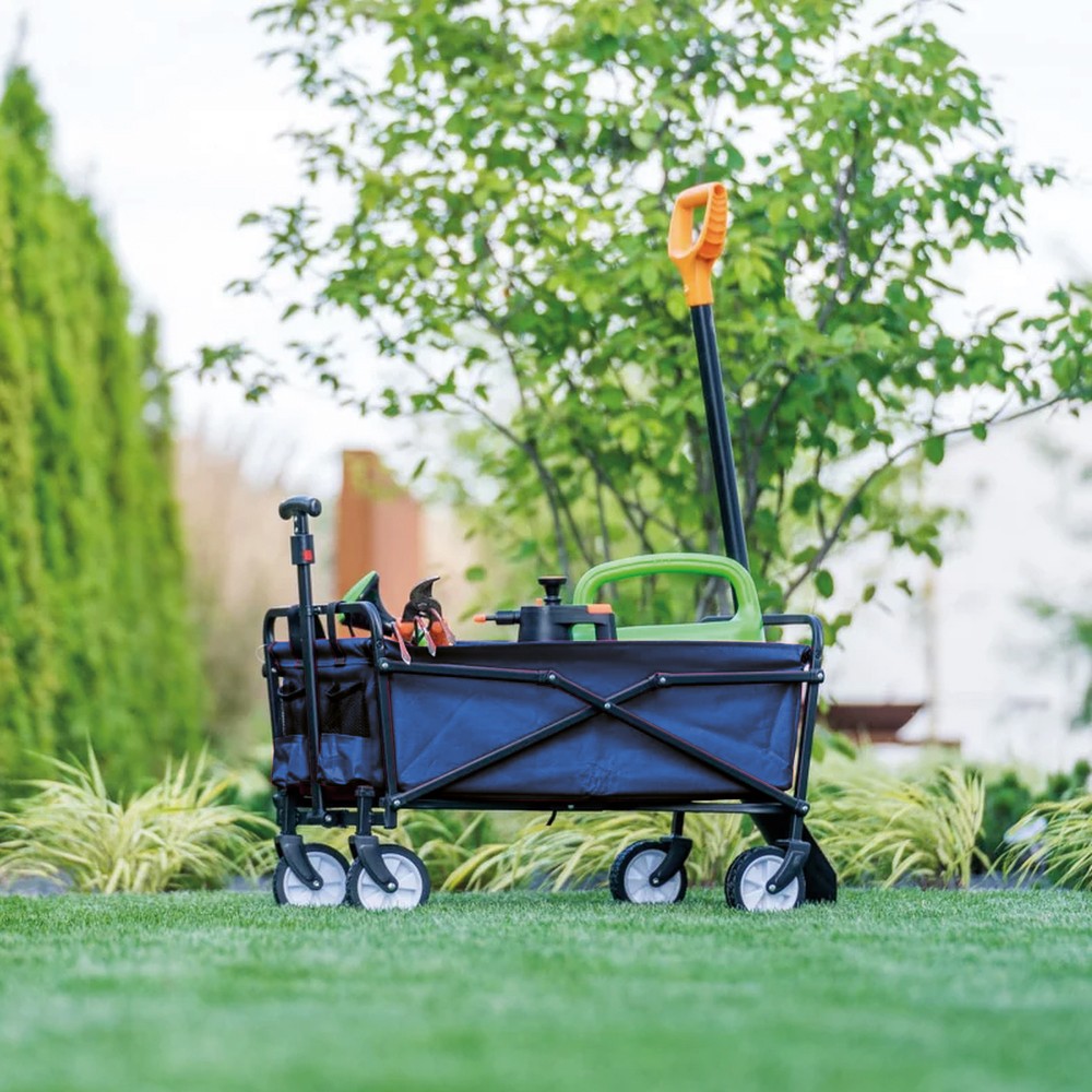 Az összecsukható szállítókocsi segítségére lehet akár 60 kg-os rakomány szállításánál. A kerti kocsi fogantyúja állítható , ami lehetővé teszi a hossz egyéni igény szerinti beállítását. A kocsi acélvázának belsejében található, könnyen eltávolítható anyag könnyen tisztítható. Az oldalzsebek további előnyt jelentenek. A szállítókocsi összecsukható, így könnyen tárolható.