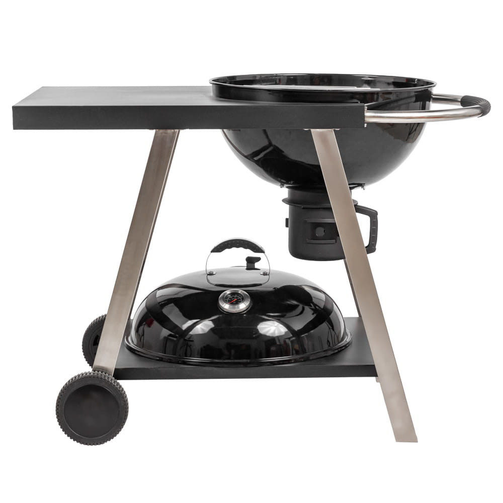 A gömbölyű, acél fedéllel ellátott szerkezetnek köszönhetően könnyen szabályozható a hőmérséklet grillezés közben, a beépített hőmérő pedig lehetővé teszi az ételek optimális sütési hőmérsékletének elérését. A termék oldalsó és alsó polccal van felszerelve, amely további helyet biztosít a konyhai eszközök, fűszerek és edények tárolására. Ennek köszönhetően mindig kéznél van minden, ami a grillezéshez szükséges.