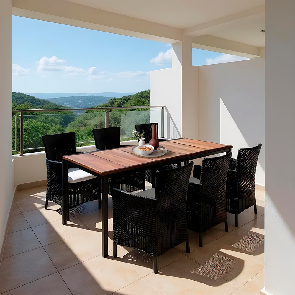 A Nadia Large garnitúrában minden benne van, ami egy gondtalan kültéri étkezéshez, nyári estéhez vagy baráti összejövetelhez kell. A hat darab kényelmes, kartámaszos Iowa fotelhez egy tágas, 200 × 95 cm-es Porto étkezőasztal tartozik – mindez időjárásálló, UV-védett, stílusos kivitelben.