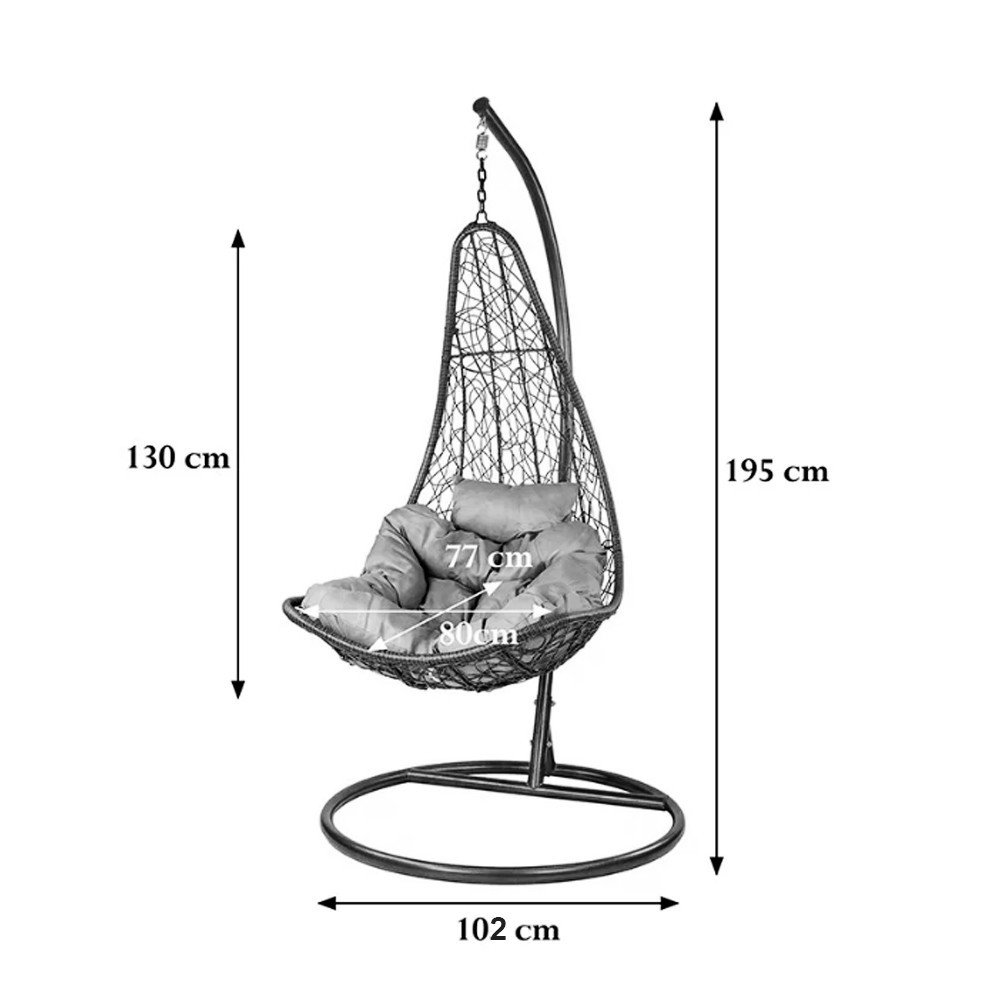 A fotel kétrészes, puha szürke párnával van ellátva, amelyek kivehető, vízálló párnahuzattal rendelkezik, így könnyű a tisztítása. A 195 cm magas és 102 cm átmérőjű váz szerkezet és a 130 cm magas, 80 cm ülőszéles és 77 cm ülőmélységű kosár komfortos helyet kínál a pihenéshez.