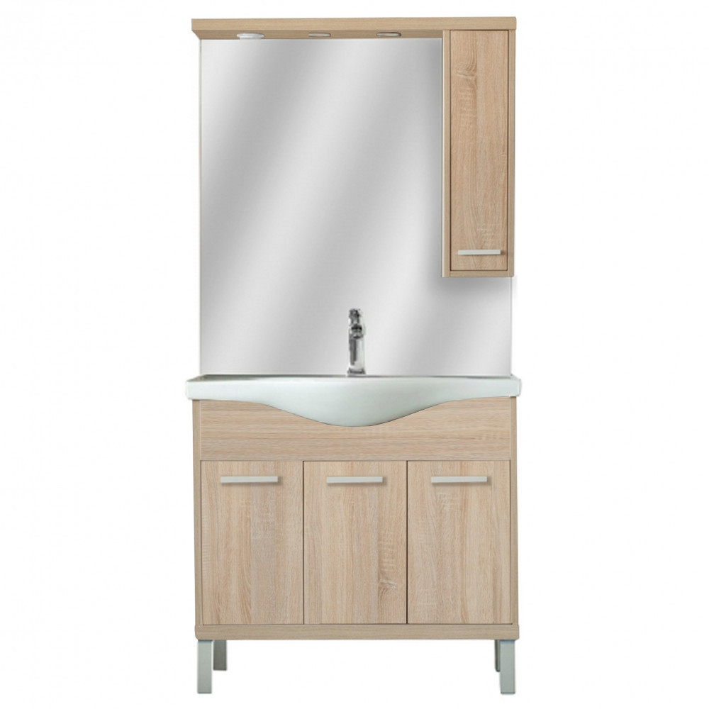 A fürdőszobabútor kevés helyet foglal viszont tágas alsó és felső szekrénnyel rendelkezik ahol, kényelmesen elférnek a fürdőszobai pipere eszközök. Kevés helyigénye miatt kisebb fürdőszobák berendezésére is alkalmas, például panel lakásokban. A termék magas minőségű bútorlapból készül és színben passzoló élzárókkal van ellátva. A fürdőszobabútor mosdóval együtt kapható.