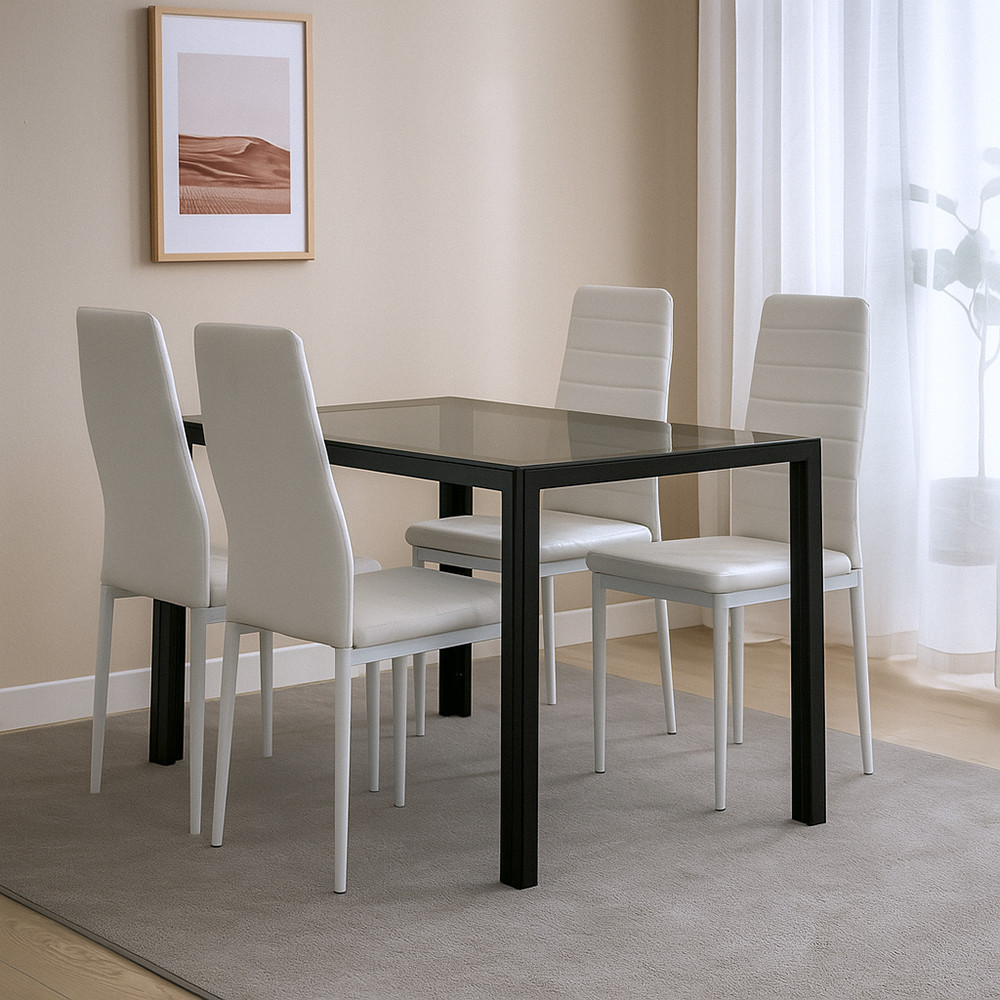 A Nicole 4+1 étkezőgarnitúra kiváló választás mindazok számára, akik szeretik a markáns, sötét tónusokat, de nem akarnak kompromisszumot kötni a kényelem és a funkcionalitás terén. A füstszürke üvegasztal és a fehér étkezőszékek harmonikus egységet alkotnak, mely tökéletesen illik modern, minimalista vagy ipari stílusú enteriőrbe.