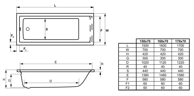 Niwell Sofi 150 x 70 egyenes akril fürdőkád – WANW.MAE.150.070WH