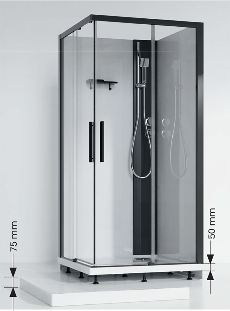 A zuhanytálca 5 cm magas, azonban opcionálisan választható 7,5 cm magas előlap és lábak, amellyel a teljes magasság 12,5 cm-re növelhető. A csomag tartalmazza a zuhanytálca szifont, így a beépítés még gördülékenyebb.