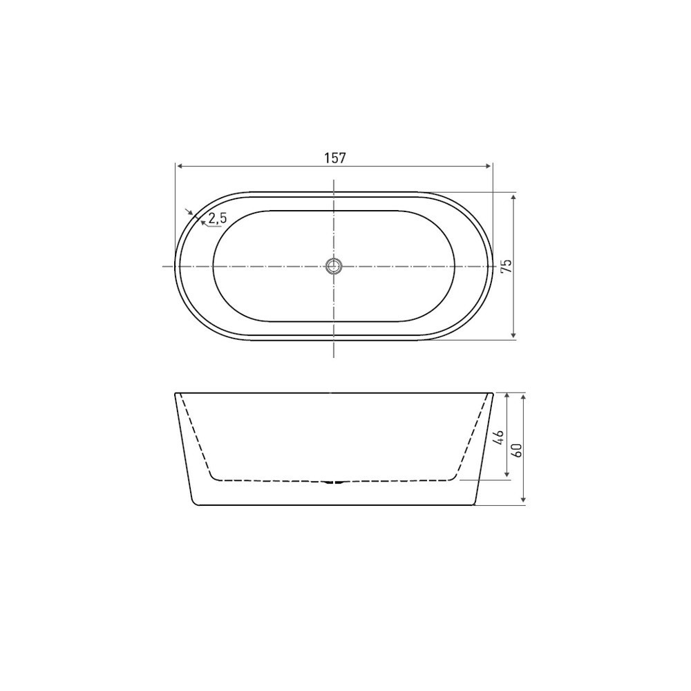 Külső méretei: teljes szélesség 74cm, teljes hossz 157cm, teljes magasság 61cm. Belső méretei: a kád szélessége 69 cm, a kád alja 53 cm széles, a kád hossza 151 cm, a kád aljának hossza 120 cm. Teljes mélység 45cm. A lefolyó átmérője 5cm. Alakja ovális, mely eleganciát és letisztultságot sugároz. Tartalmazza a click-clack lefolyót, szifont. A kád egy rejtett vázon áll.