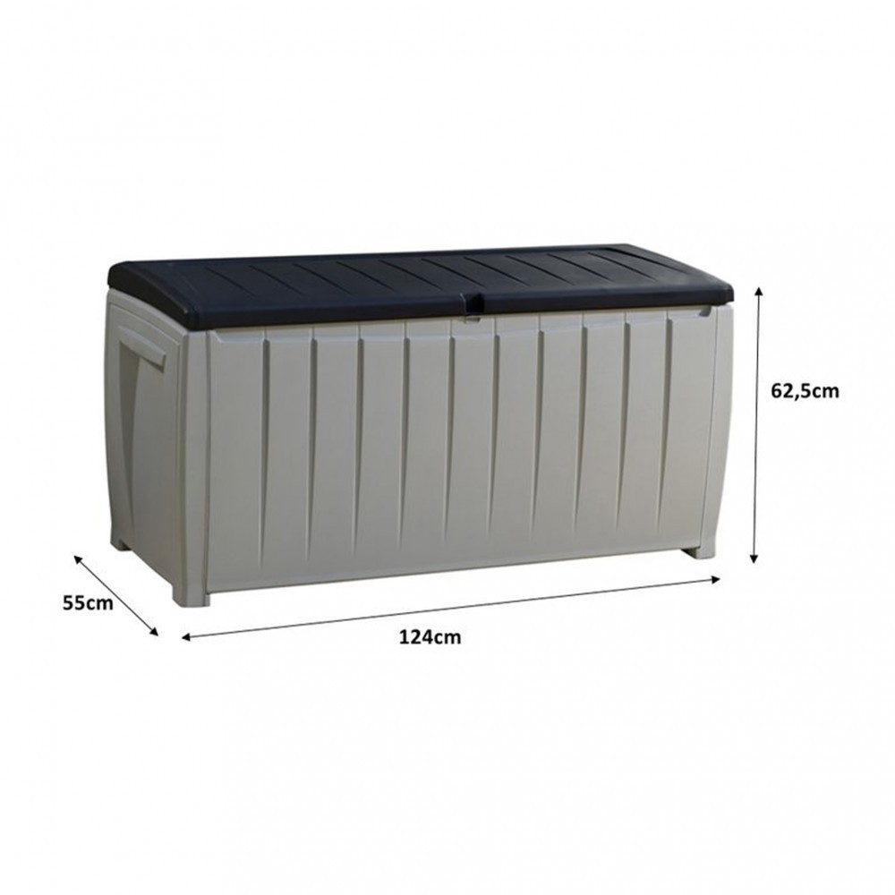 A Keter Novel Storage Box kerti tároló egy multifunkciós modell. Nem csak tárolóhelyként, hanem kerti padként is felhasználható. Akár 220 kilogramm terhelést is képes megtartani – rajta akár két felnőtt is ülhet. A kerti láda tartós és stabil. Az oldalsó fogantyúk lehetővé teszik a rekesz könnyű mozgatását. A fekete fedéllel ellátott szürke tároló gyakorlatilag bármilyen környezetben jól néz ki.