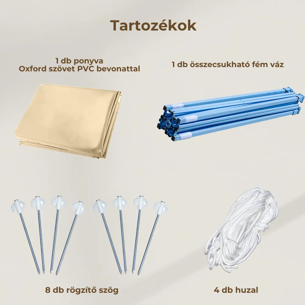 • Tartozékok: A pavilon stabilitását a sarkoknál található karikák, a mellékelt huzalok és rögzítő szegek biztosítják. A csomag tartalmazza mind a 4 db huzalt, mind a 4 db rögzítő szöget, így garantálva a biztonságos és stabil felállítást.