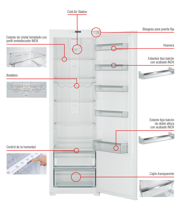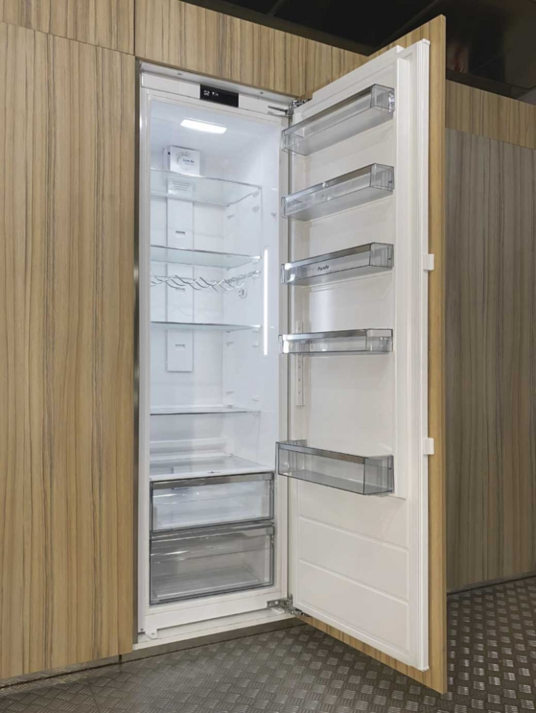 Beépíthető hűtőszekrény, E energiaosztály, 197 L, Enrgiafogy.: 232 kW/év, bútorfront: max. 50 Kg, Door-on-door zsanér, Defrost, króm üvegtartó rács, 39 dB, belső LED vil., méret:1770x540x545 mm