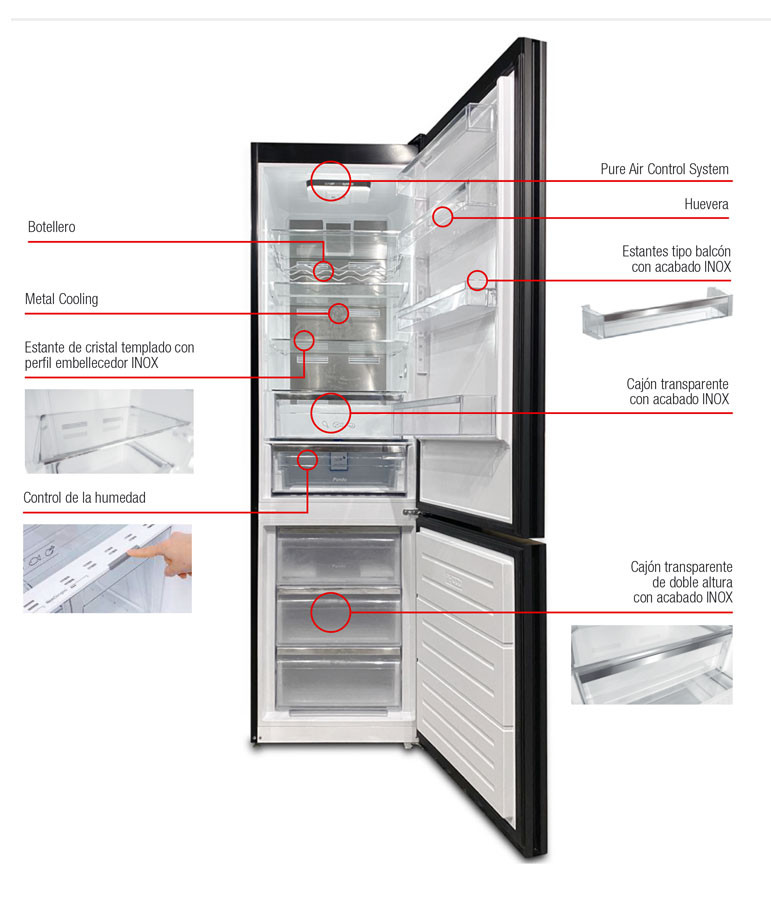 Természetes No Frost, áramló hűtőtechnológia, Maxi-Fresh technológia, Pure Air rendszer, fém hűtés, króm üvegtartó rács, Zéró zone fiók