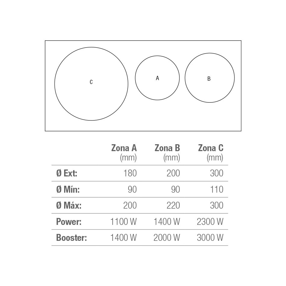 • jobboldali főzőzóna: 110 mm / 300 mm / 2300/3000 W,