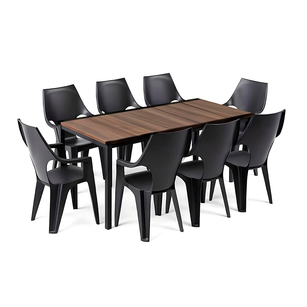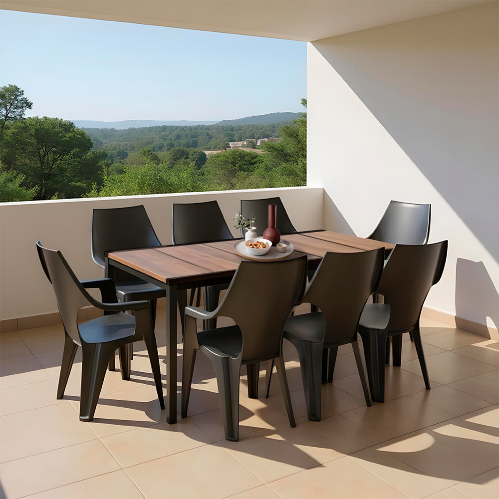 Minden, ami a hétvégi, ráérős brunch-tól a baráti grillpartiig kell: hat Dante magas támlás kartámaszos szék + egy 200 × 95 cm-es Porto étkezőasztal – prémium műanyagból, kompromisszumok nélküli kényelemmel és nulla karbantartással.