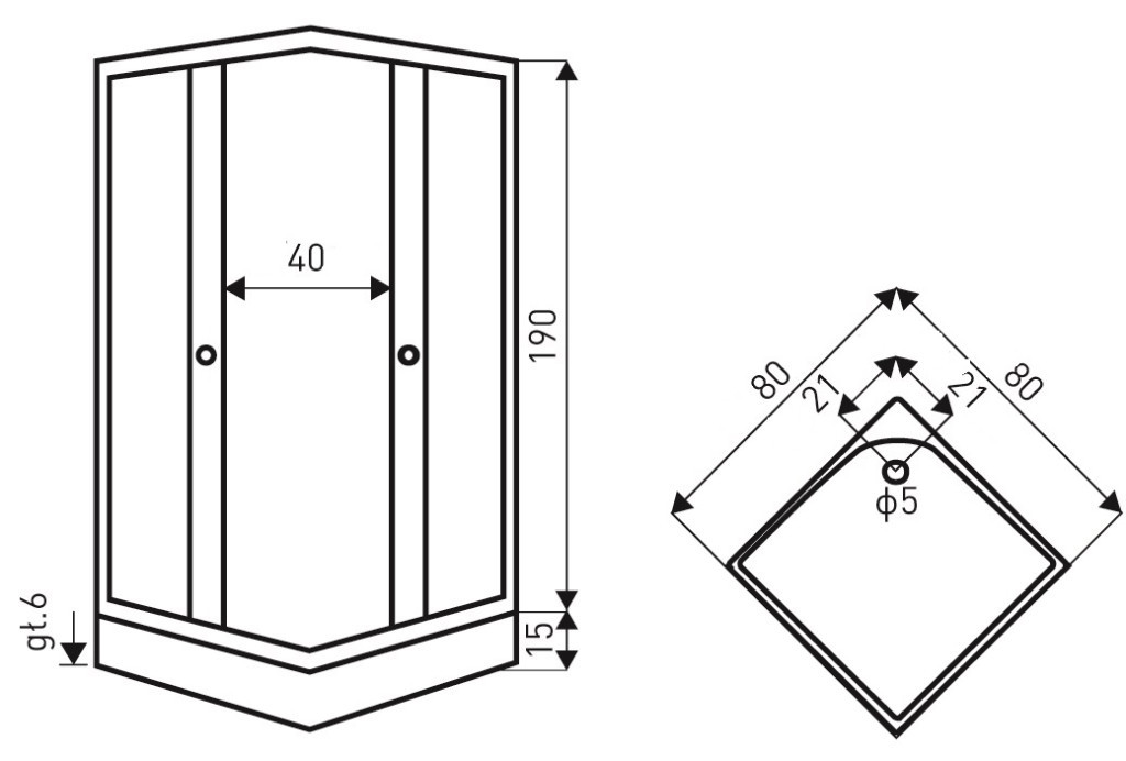 • Méretek: 80 × 80 × 205 cm (kabinház); tálca magassága 15 cm