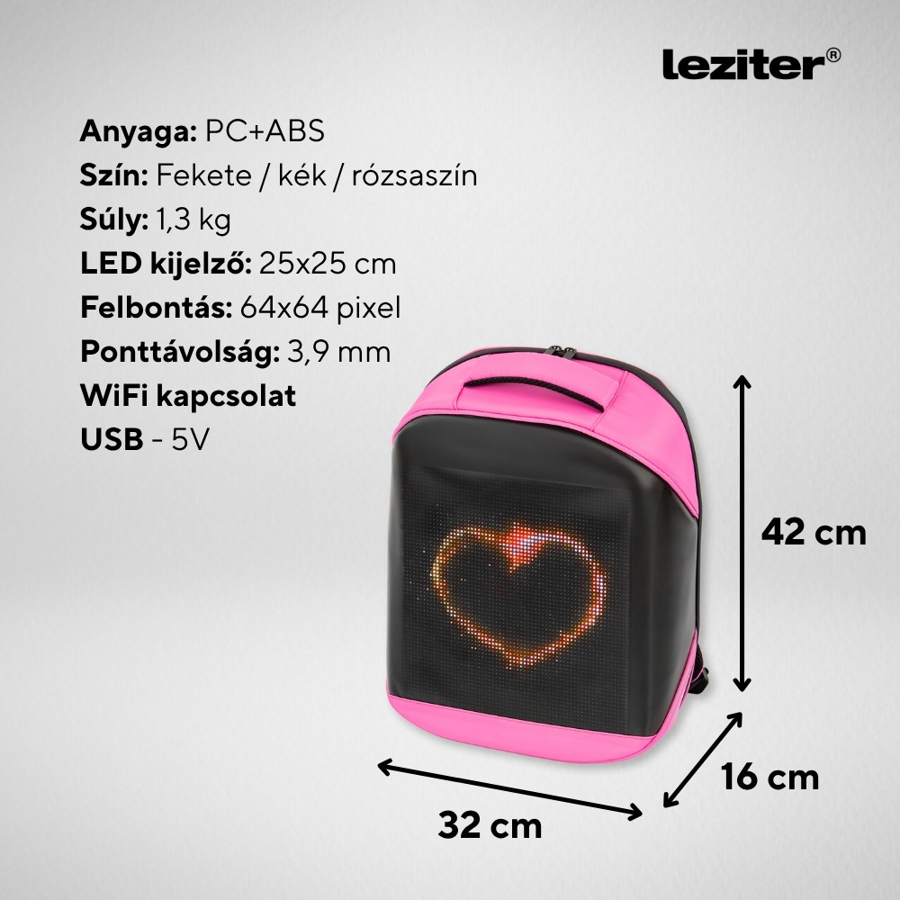 Legyen a Tiéd a Leziter Pixa LED okos hátizsák, és mutasd meg a világnak a stílusod, a kreativitásod és az egyéniséged minden lépéseddel – mert mostantól te írod a saját fényüzeneteidet!