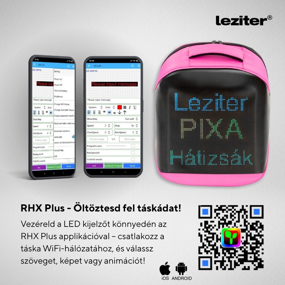 A kijelzőt WiFi kapcsolattal vezérelheted, az RHX Plus nevű applikáción keresztül, amely elérhető Androidra és iOS-re is. A csatlakozás egyszerű: a táska saját WiFi-hálózatához kell kapcsolódni, majd saját grafikát, szöveget, animációt vagy akár pixelartot is feltölthetsz a kijelzőre néhány kattintással. A QR-kód az útmutatóban található, amely megkönnyíti a letöltést.