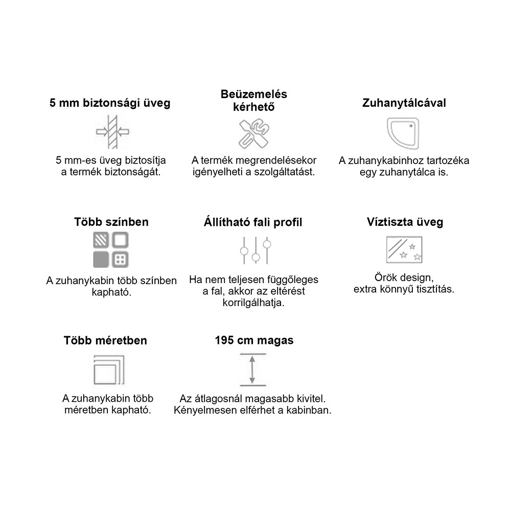 A Marco Black II zuhanykabin a fürdőszobai elegancia megtestesítője. Ez a termék két praktikus méretben érhető el: 80x80x195 cm és 90x90x195 cm, mindkettő zuhanytálcával együtt. A kabin nem csupán esztétikus, de funkcionális is: keverő csapteleppel, funkcióválasztó karral, 3 funkciós kézi zuhany és pipere polccal felszerelt. A teljes magasságban végigfutó króm színű zuhanypanel a modern design és a praktikum tökéletes összhangját teremti meg, ezáltal a Marco Black II zuhanykabin minden fürdőszoba ékkövévé válik.