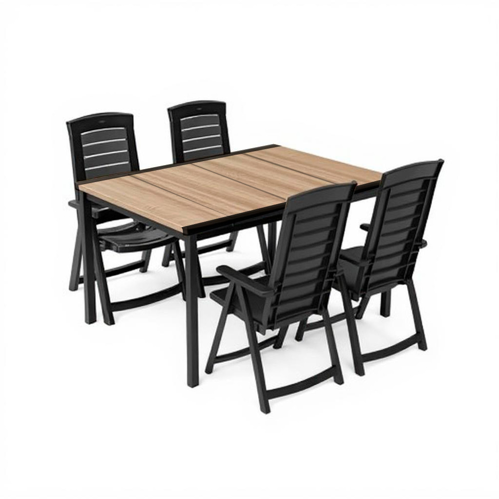 • Szett tartalma: 1 db Porto 160 műanyag kerti asztal (kőris színben) + 4 db Allibert Aruba dönthető kerti szék (grafit színben)