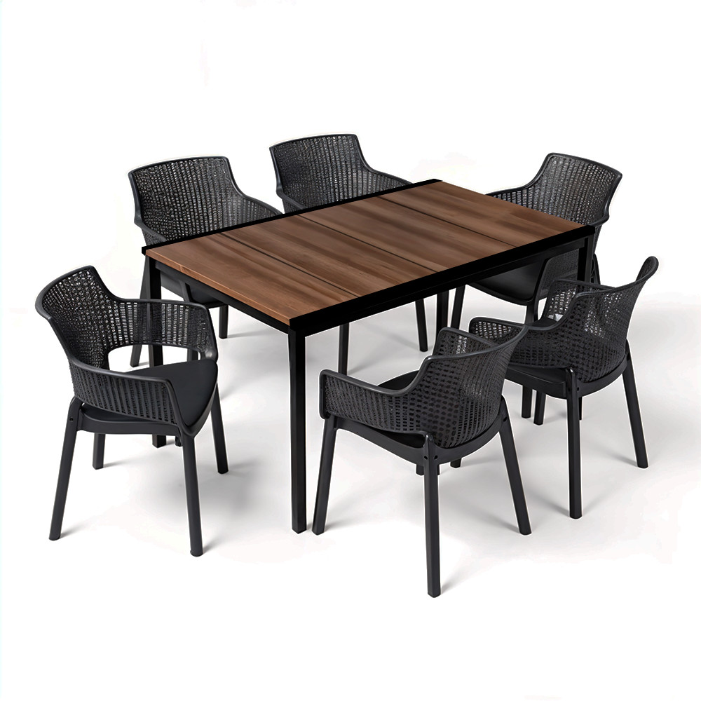 A Romen 6+1 kerti garnitúra ideális választás, ha nem szeretnél kompromisszumot kötni a kényelem, a tartósság és a megjelenés között. A dió színű, fa hatású Porto 160 asztal és a grafit színű Eva székek stílusos párost alkotnak, amely tökéletesen illik egy modern kertbe vagy teraszra.