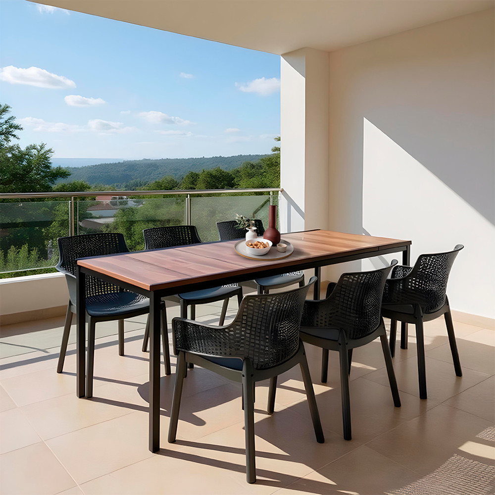 A meleg dió tónusú asztallap és a mély grafit székek elegáns, kortárs hangulatot teremtenek. Legyen a teraszod skandináv, mediterrán vagy ipari stílusú, a Romen Large garnitúra központi elemmé válik, ami stílust és harmóniát kölcsönöz a kültéri térnek.