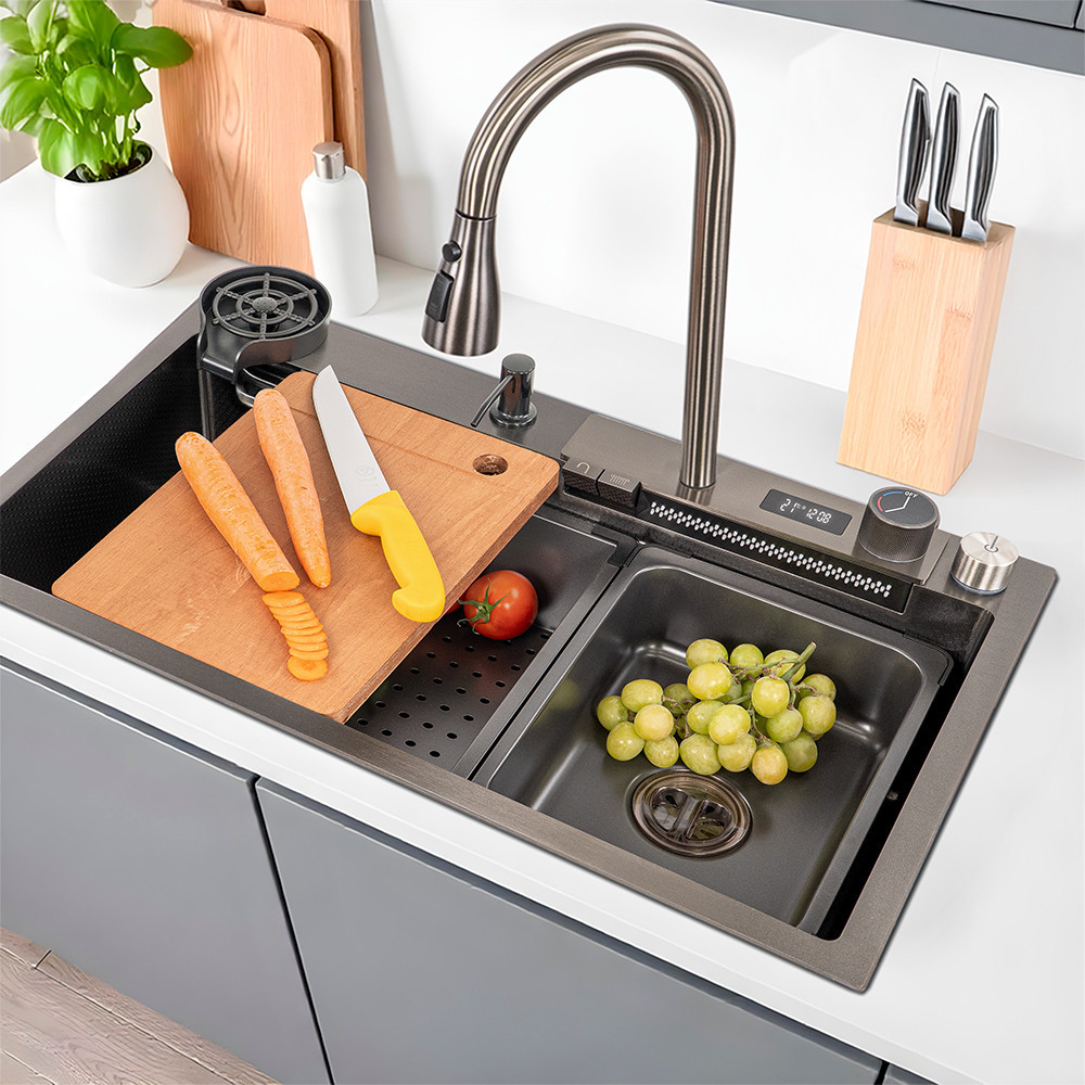 A Rose II mosogató nemcsak praktikus, hanem egyedi megoldásokat is kínál. Digitális kijelzője valós idejű hőmérsékletjelzést mutat, így mindig pontosan tudod, milyen hőmérsékletű vizet használsz. Az intuitív váltókarral egyszerűen szabályozhatod a víznyomást és a vízfolyás típusát. A hangszigetelő panelek csökkentik a zajszintet, így a mosogatás kevésbé lesz zavaró a konyhai tevékenységek során.