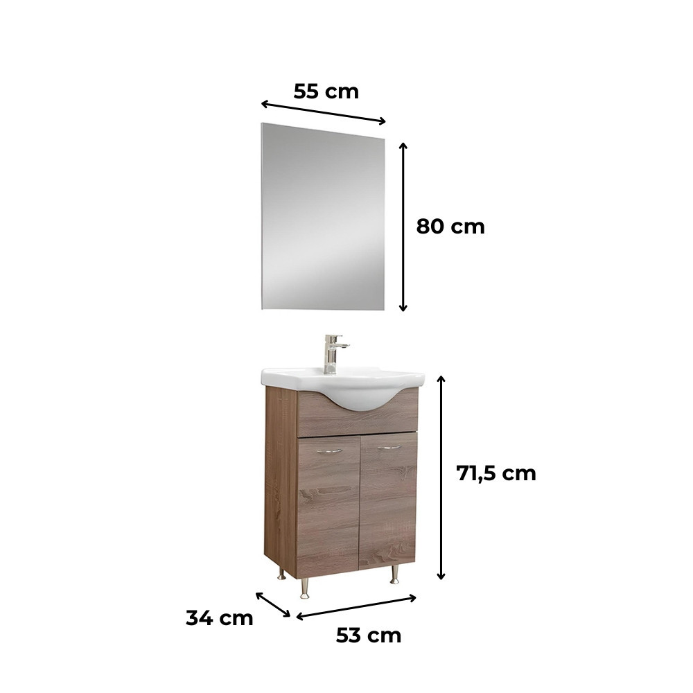 A bútor mindössze 53 cm széles, mégis elegendő tárolóhelyet kínál a fürdőszobai kellékek számára. Álló kivitelű alsószekrénye belül polcos elrendezésű, ajtóval zárható, így segít rendet tartani a mindennapokban.