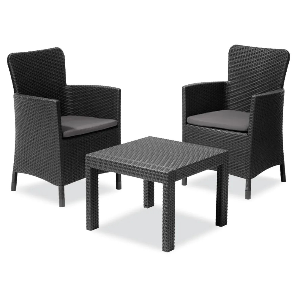 A grafit színű rattan kerti bútor szett két darab 62 x 60 x 89 cm-es fotelből és egy 59 x 59 x 43 cm-es négyszögletű asztalból áll. Ez egy kiváló minőségű termék, amely a legjobb minőségű fröccsöntött műanyagból készült.