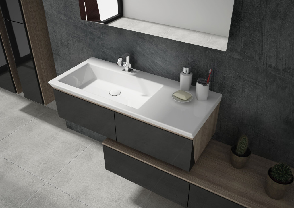 Pultba és bútorba építhető és falra is csavarokkal felszerelhető szögletes mosdó, amely kiváló minőségű kerámiából készül, így magas ellenálló képesség és tartósság jellemzi. A mosdó középen elhelyezkedő csapfurattal és túlfolyóval rendelkezik.