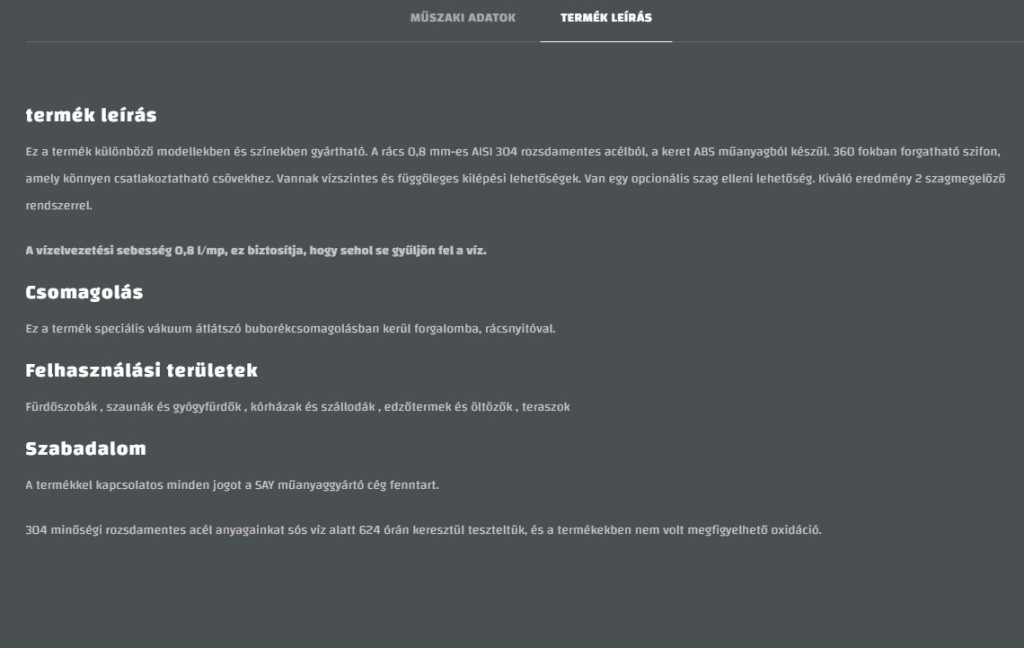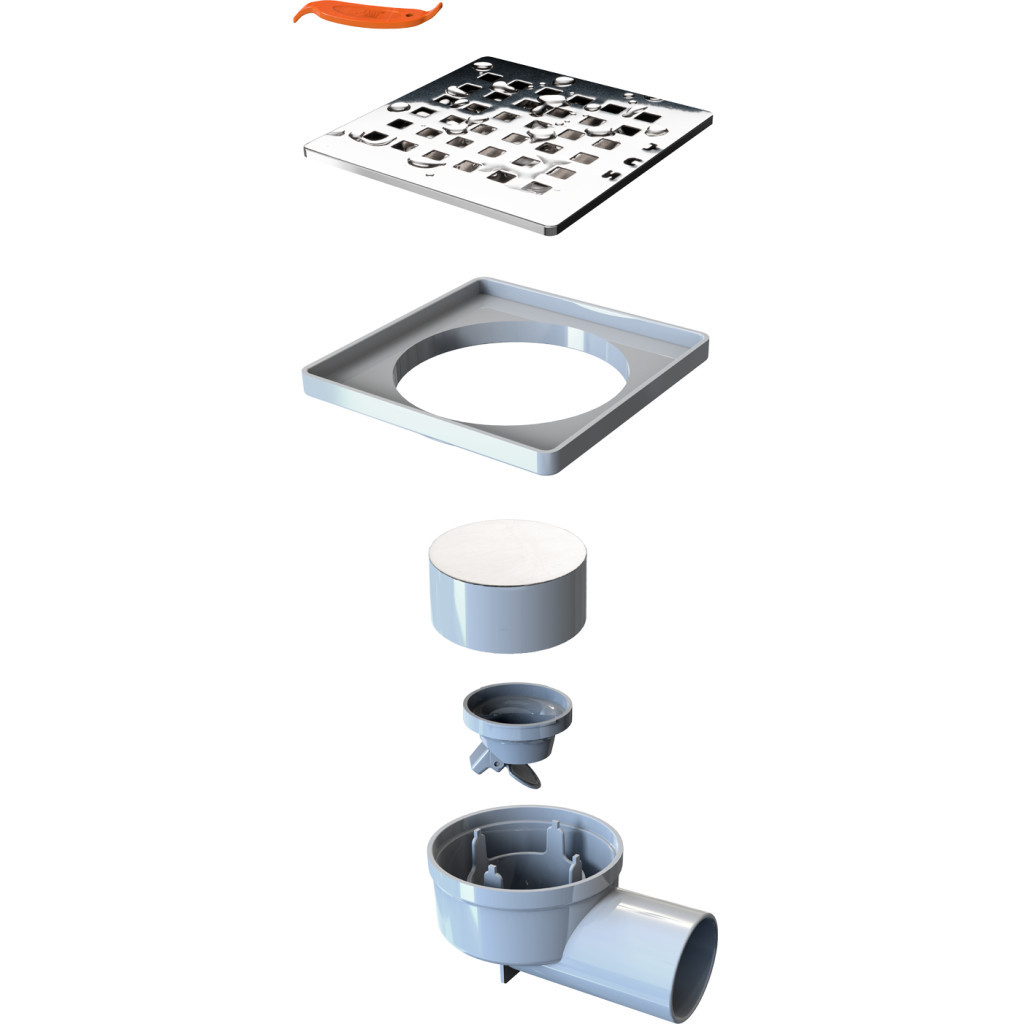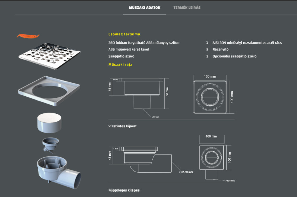 A rács 0,6 mm-es AISI 304 rozsdamentes acélból, a keret ABS műanyagból készül. 360 fokban forgatható szifon, amely könnyen csatlakoztatható csövekhez.