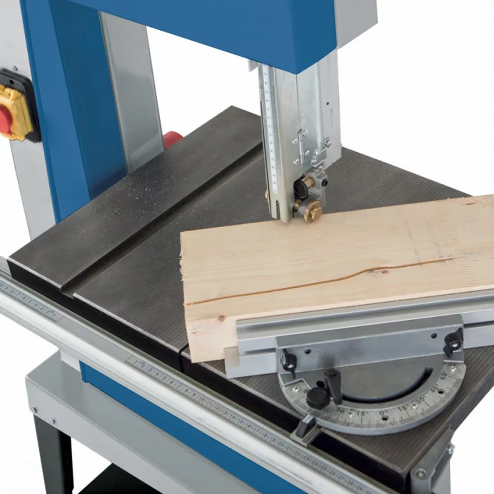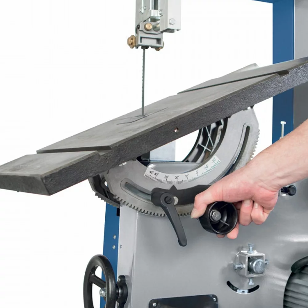 Ez része az egyedülálló sebességbeállító Vario Drive rendszernek. A szalagfűrész felső befogókara forgógomb segítségével beállítható. A fűrészszalag villámgyorsan kicserélhető az egyszerű szerkezetű, gyors kioldókarnak köszönhetően. Masszív, -8°-tól +45°-ig dönthető öntvény munkaasztal rendelkezik. A munkaasztal megfelelő támasztékot biztosít a megmunkált anyagnak. Felületi kiképzésének köszönhetően jelentősen csökkenti a súrlódást, így az anyagot pontosan lehet rajta mozgatni. A nagyon pontos párhuzamvezető a fűrészszalag mindkét oldalán rögzíthető és a jobb olvashatóság érdekében nagyítóval rendelkezik. A szalagfűrész kiváló, 205 mm-es vágómagassággal és 306 mm-es vágószélességgel képes dolgozni.