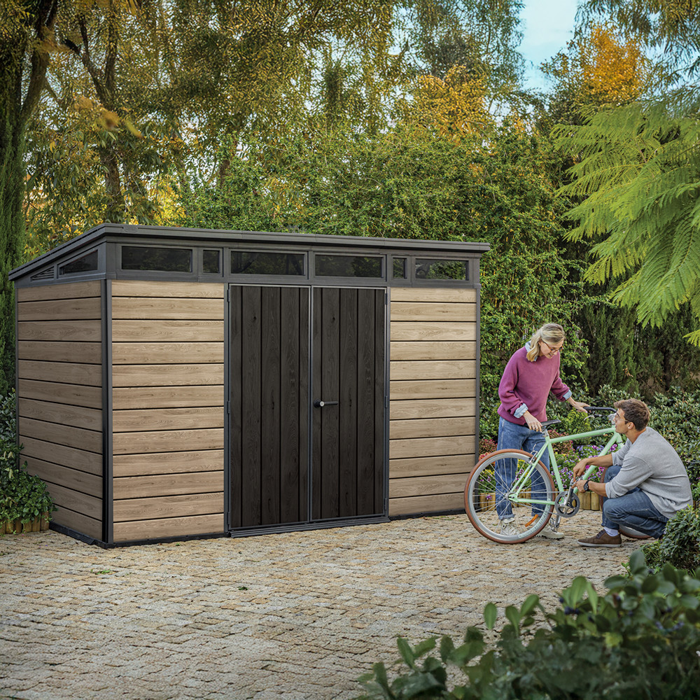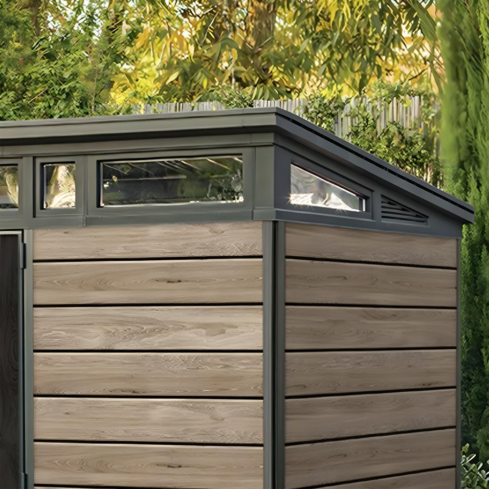 A Signature PENT 11×7 kerti ház ötvözi az esztétikát és a funkcionalitást. A ferde tető és letisztult vonalvezetés tökéletesen illeszkedik a modern kertépítési trendekhez, míg a kőrisfa színű DECOCOAT technológia időjárásálló felületet biztosít.
