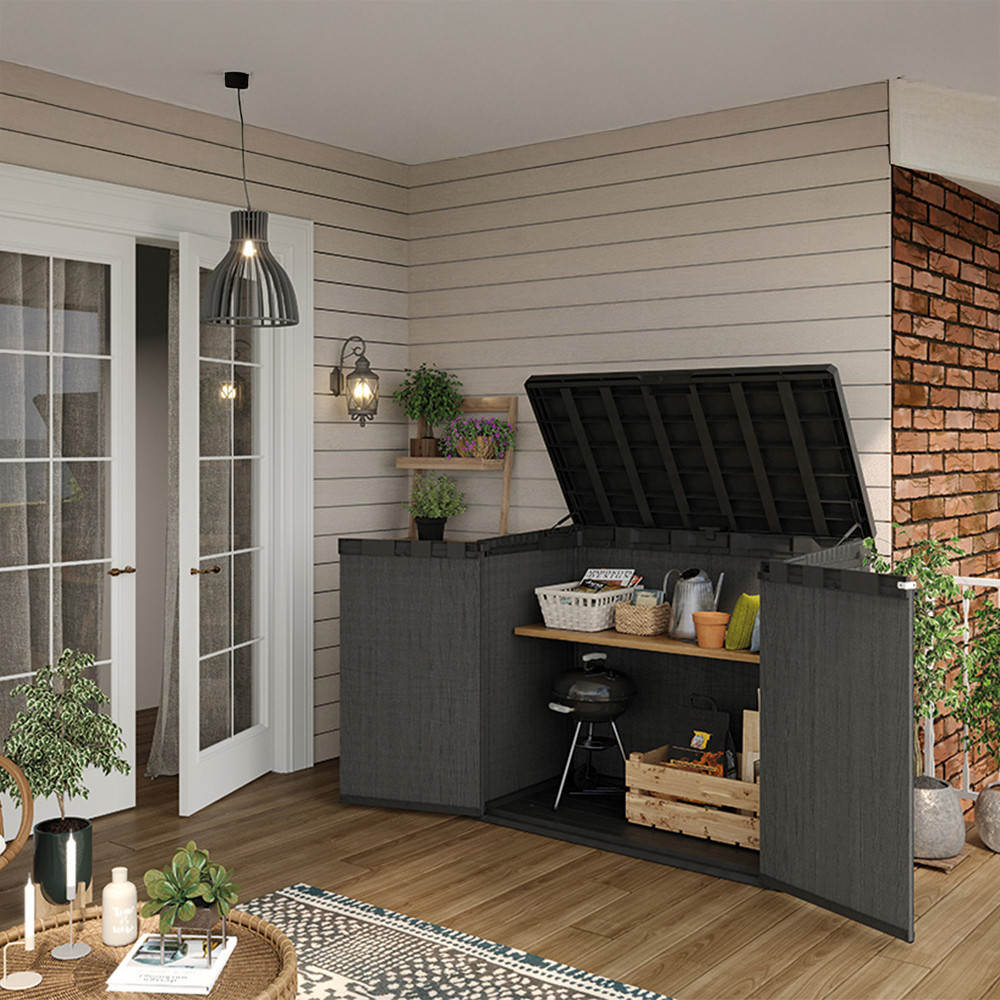 A Keter Sio Darwin műanyag kerti tároló 1100L egy praktikus, masszív és időjárásálló kültéri tároló, amely esztétikus megjelenésével tökéletesen illeszkedik a kertbe. Felnyitható tetővel és dupla ajtóval rendelkezik, így a legnagyobb tárgyakat is könnyedén elhelyezheted benne. A beépített szellőzőrendszer biztosítja a száraz tárolást, míg a polcozható belső tér segít rendszerezni a kisebb tárgyakat is.