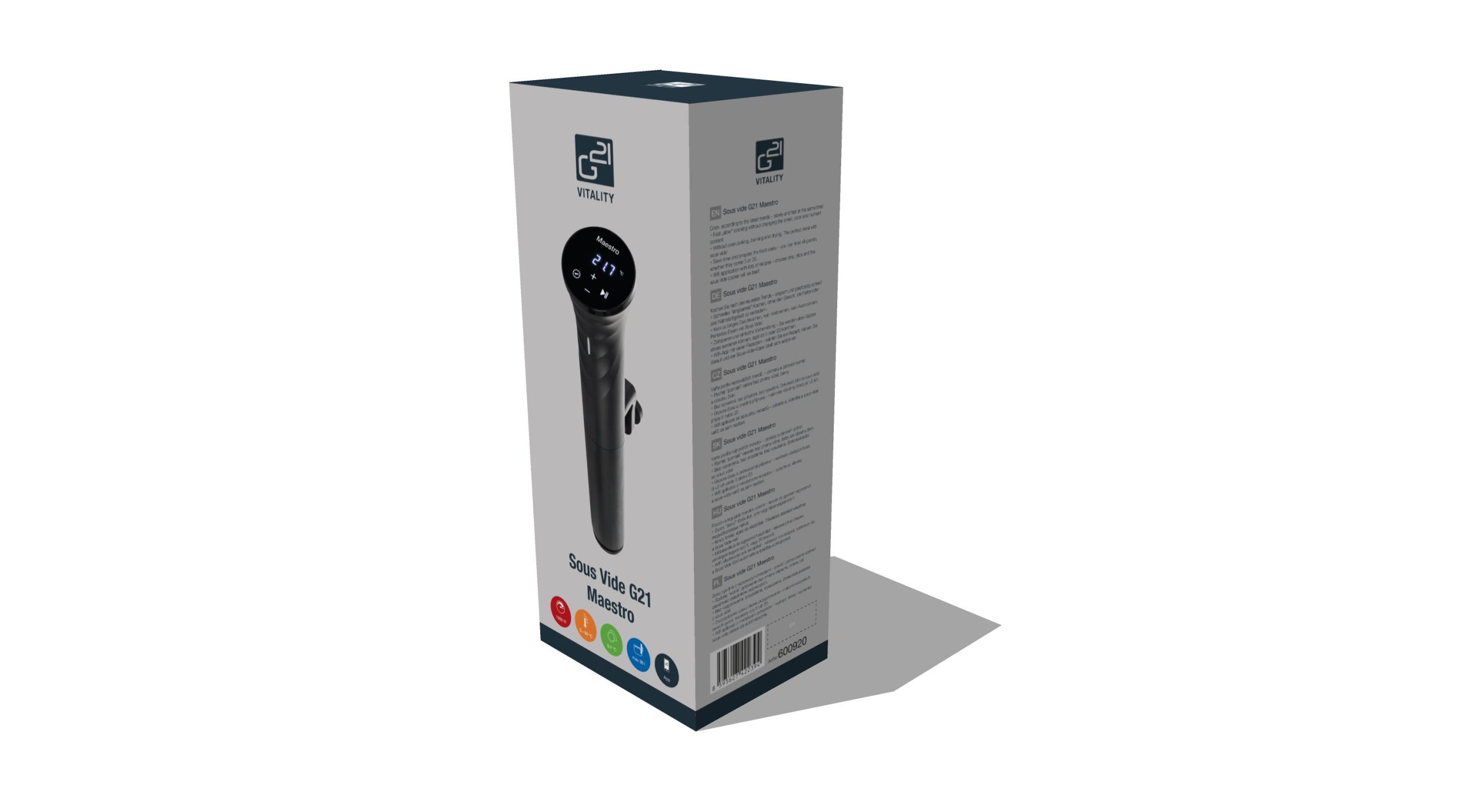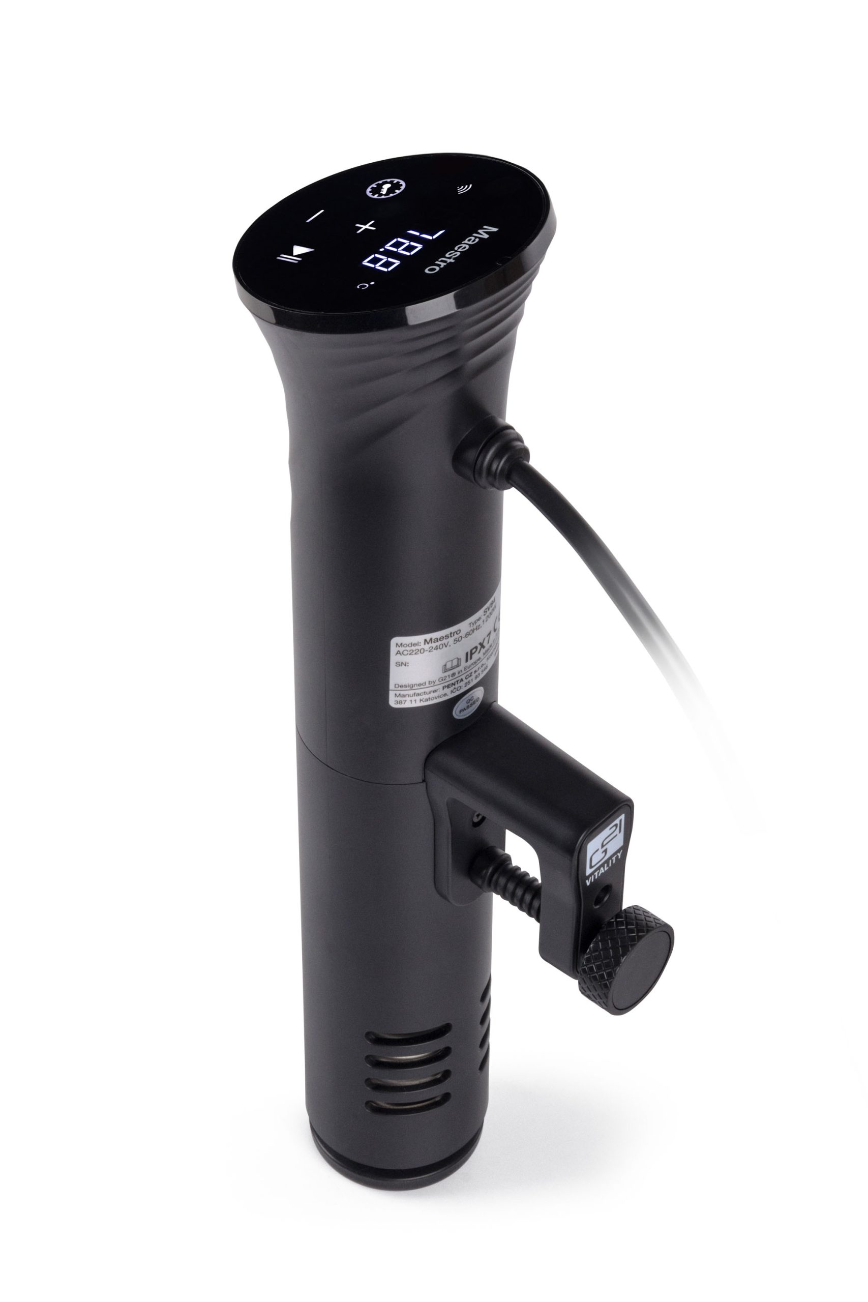 A G21 Maestro sous-vide főző a szuvidolás igazi mestere. Figyeltünk a legapróbb részletekre és természetesen a biztonságra is. Elegáns kivitelezésű, két fő komponensből áll: egy merülő részből, amelyben a főzőspirál található valamint egy felső részből, amelyben az érintőképernyő és az elektronika található. A G21 Maestro sous-vide főző kiegészítőivel biztonságosan rögzítheti a főzőedény széléhez.