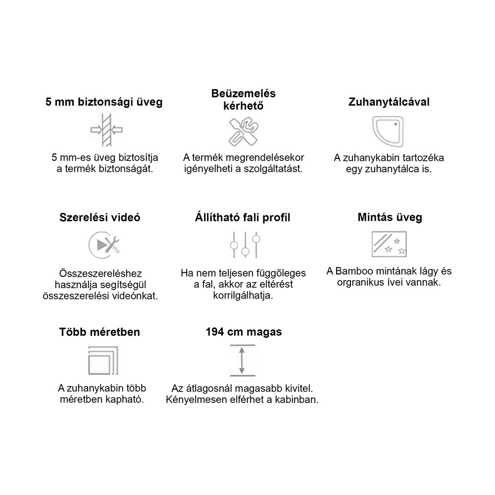 Műanyag vízzáró profilokkal rendelkezik, hogy a víz a kabinon belül maradjon. Az állítható fali profilok segítségével, ha nem teljesen függőleges a fal, akár 15 mm eltérést is korrigálhat. Amennyiben tálca nélkül rendeli, 180 cm-es magassággal, ha pedig szettben erősített akril zuhanytálcával, akkor 194 cm-es magassággal számolhat.