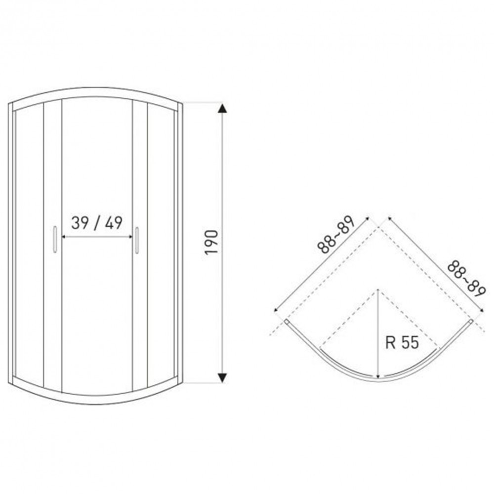 A zuhanykabin 6 mm-es biztonsági üveggel van ellátva. A mérete 89x89x190 cm. A zuhanykabin üvege vízlepergető védőbevonattal van ellátva. Dupla tolóajtókkal rendelkezik.Íves r55-ös akril zuhanytálcával szerelhető. (ALAN vagy ARON modell.) Külön megvásárolható.