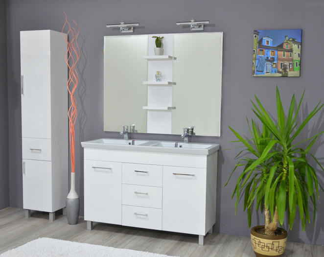 Ez a kiváló fürdőszoba bútor a legjobb megoldás, ha egy kis csillogást szeretne vinni fürdőszobájába. A dupla mosdókagylós fehér szekrény, mely tágas tárolóval rendelkezik egyszerre több embernek is helyet biztosít. A mosdó elkészítésekor kiváló minőségű kerámiát alkalmaztak, ezzel garantálva az időtállóságot. A mosdóban kettő csaptelepnek van kialakított hely (csaptelep nem tartozék).