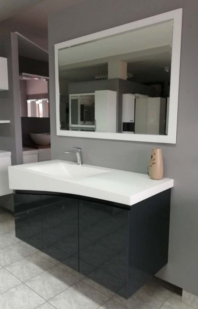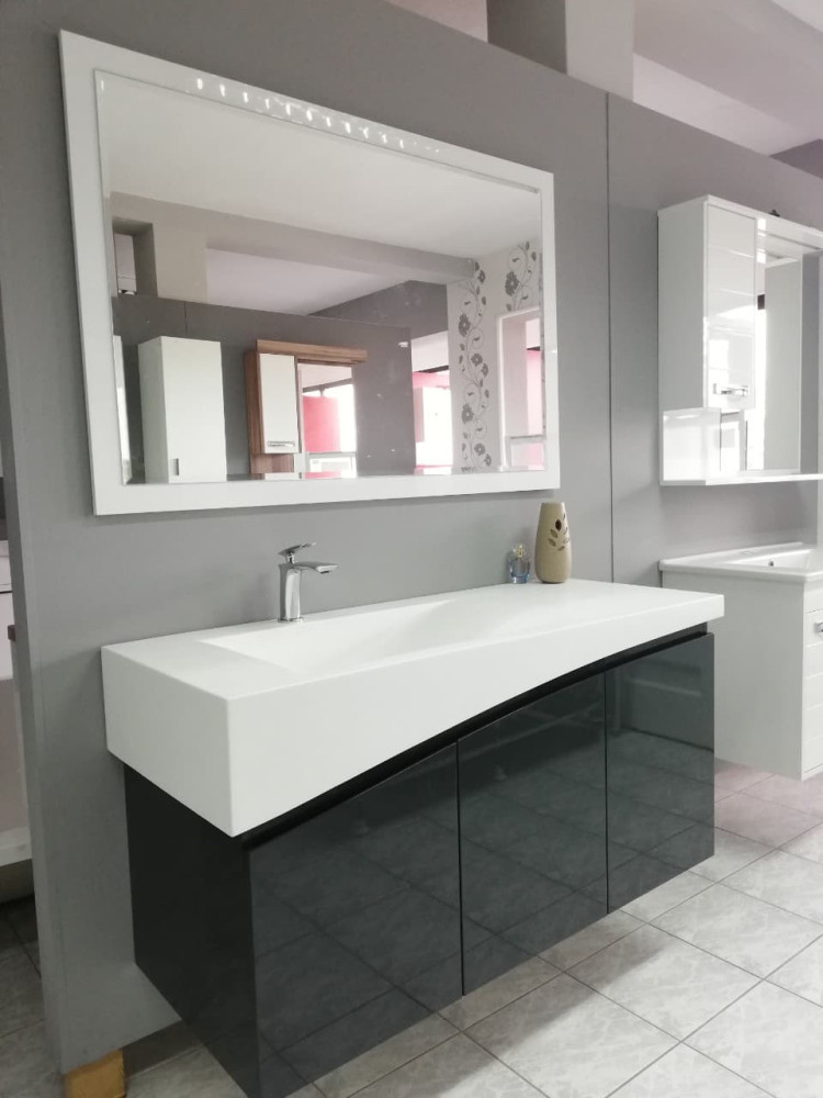 A SMYRNA 120 magasfényű antracit színe, letisztult modern vonalai és a műmárvány mosdókagyló teszi igazán népszerűvé. Nagy mérete és a 3 külön nyítható ajtó teszi lehetővé, hogy elférjen benne az egész család pipere eszköze. A bútorhoz tartozik egy méretben passzoló fehér műmárvány mosdókagyló.