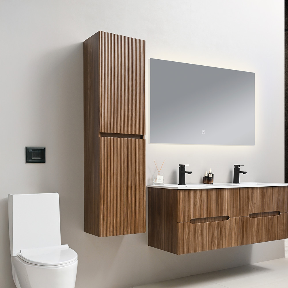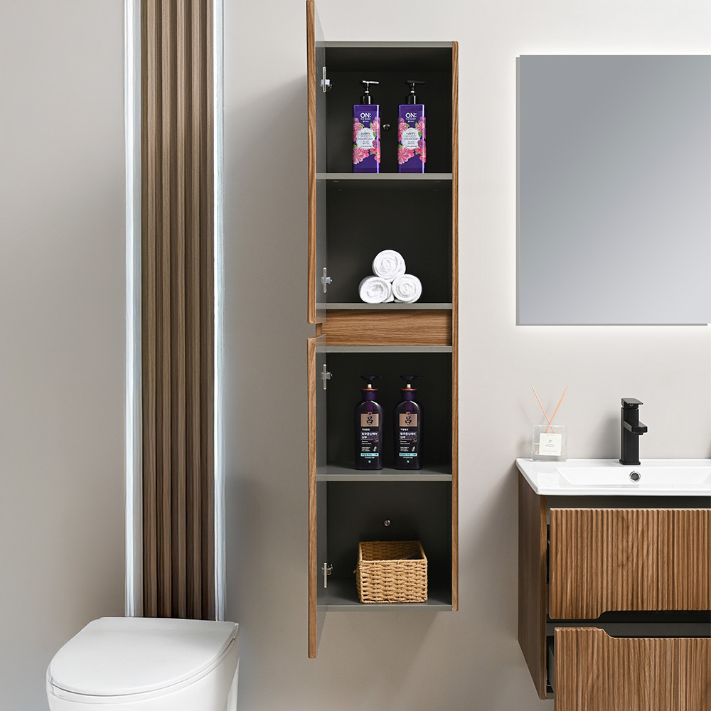 A Trent szekrény a falra szerelhető kialakításnak köszönhetően úgy teremt plusz tárolóhelyet, hogy nem vesz el semmit a padlóból. Ez különösen fontos kisebb alapterületű lakásokban, ahol minden centi számít. Azáltal, hogy a bútor a levegőben „lebeg”, megőrzi a tér légies érzetét, miközben elegendő helyet biztosít a fürdőszobai alapdaraboknak – például törölközőknek, hajápolóknak, testápolóknak, WC-papírnak vagy tisztítószereknek.