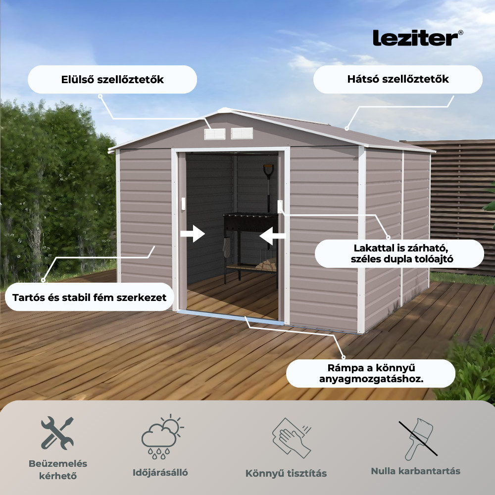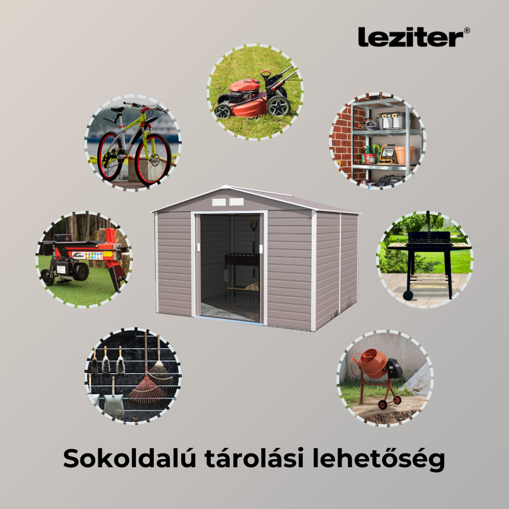 • Méret: 341 x 322 x 208 cm – A nagy méretű tároló ház ideális választás mindazok számára, akik rengeteg kerti eszközt és gépet szeretnének egy helyen tárolni.