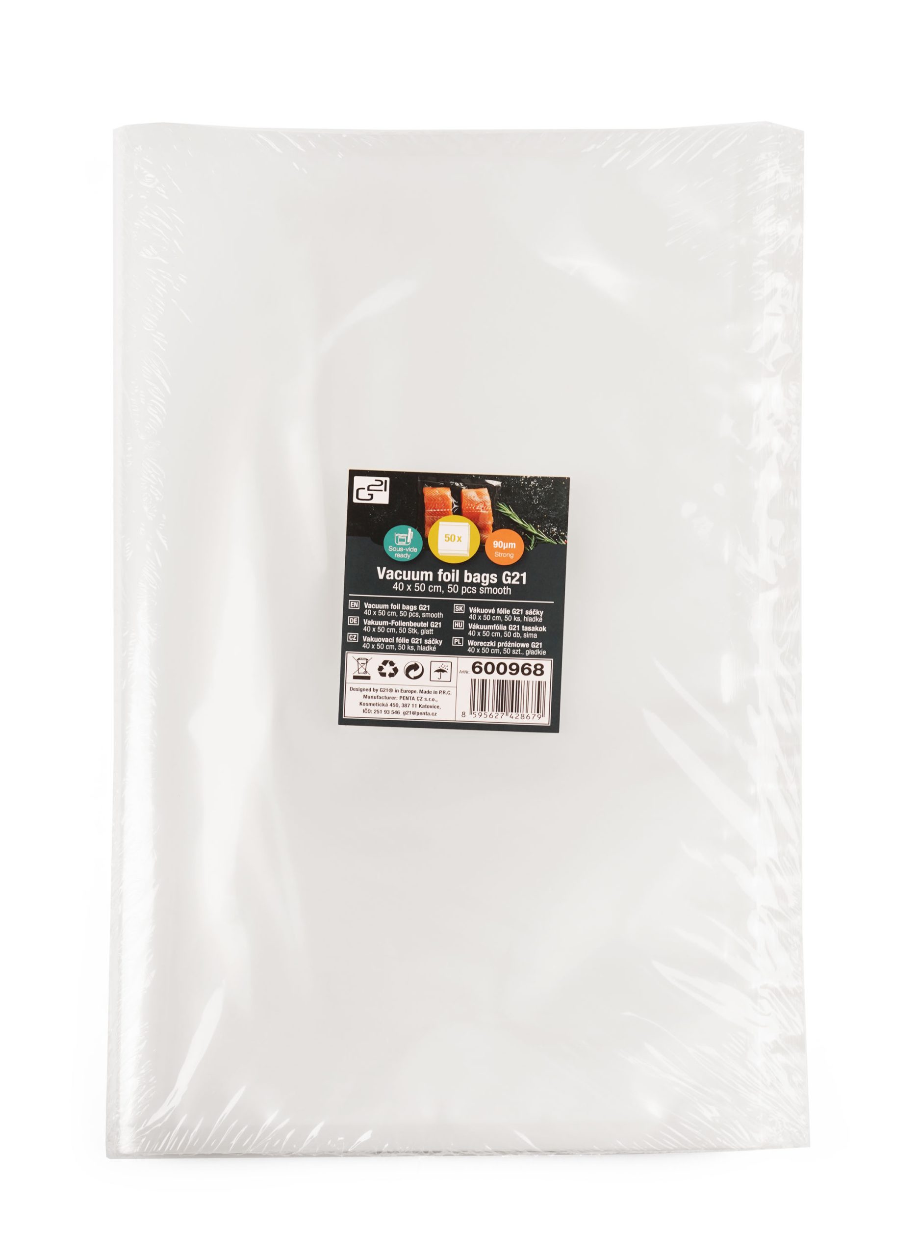 A G21 vákuumtasakok nagy előnye az egészségre ártalmatlan, 90 µm vastagságú anyag, valamint a erős és minőségi hegesztések, amelyek biztosítják a vákuum megtartását és kiváló védelmet nyújtanak a csomagolt élelmiszereknek. A sima felület gyorsabbá és kényelmesebbé teszi a vákuumozást. A vákuumozott élelmiszerek bátran feldolgozhatók sous-vide főzéssel, és a hűtőben vagy fagyasztóban való tárolás során hosszabb eltarthatóságot kapnak.