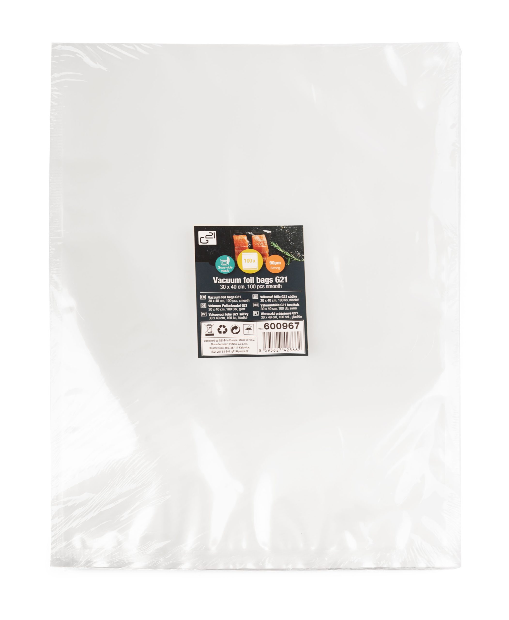 A G21 vákuumtasakok nagy előnye, hogy 90 µm vastagságú, egészségre ártalmatlan anyagból készülnek, valamint erős és tartós hegesztésekkel rendelkeznek, amelyek biztosítják a vákuum megtartását és a csomagolt élelmiszerek kiváló védelmét. A sima felület gyorsabbá és kényelmesebbé teszi a vákuumozást. A vákuumozott élelmiszereket bátran elkészítheti sous-vide főzéssel, és hosszabb ideig eltarthatók hűtőben vagy fagyasztóban történő tároláskor.
