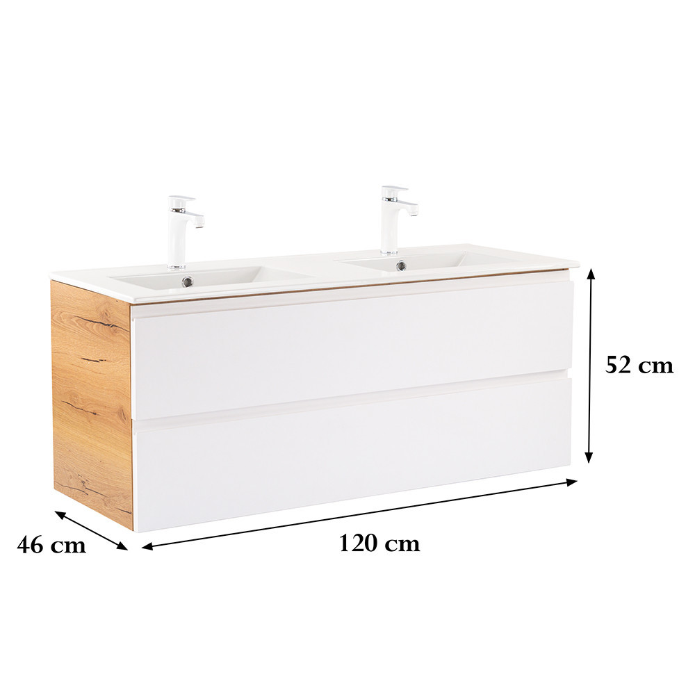 • Elegáns és praktikus mosdó: A bútor flat design kerámia mosdóval érkezik, amely két medencés kivitelű. Modern, esztétikus és könnyen tisztítható.