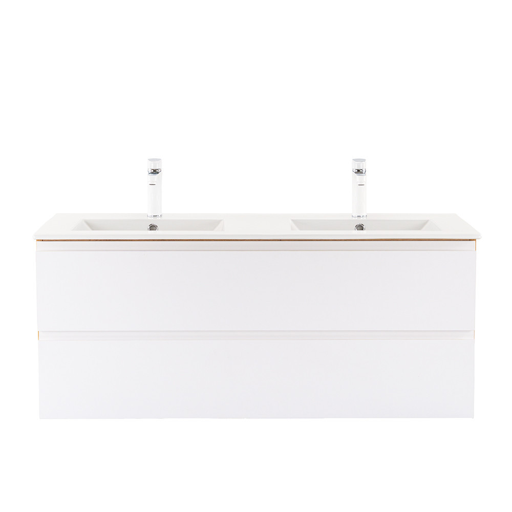 - Elegáns és praktikus mosdó: A bútor flat design kerámia mosdóval érkezik, amely két medencés kivitelű. Modern, esztétikus és könnyen tisztítható.