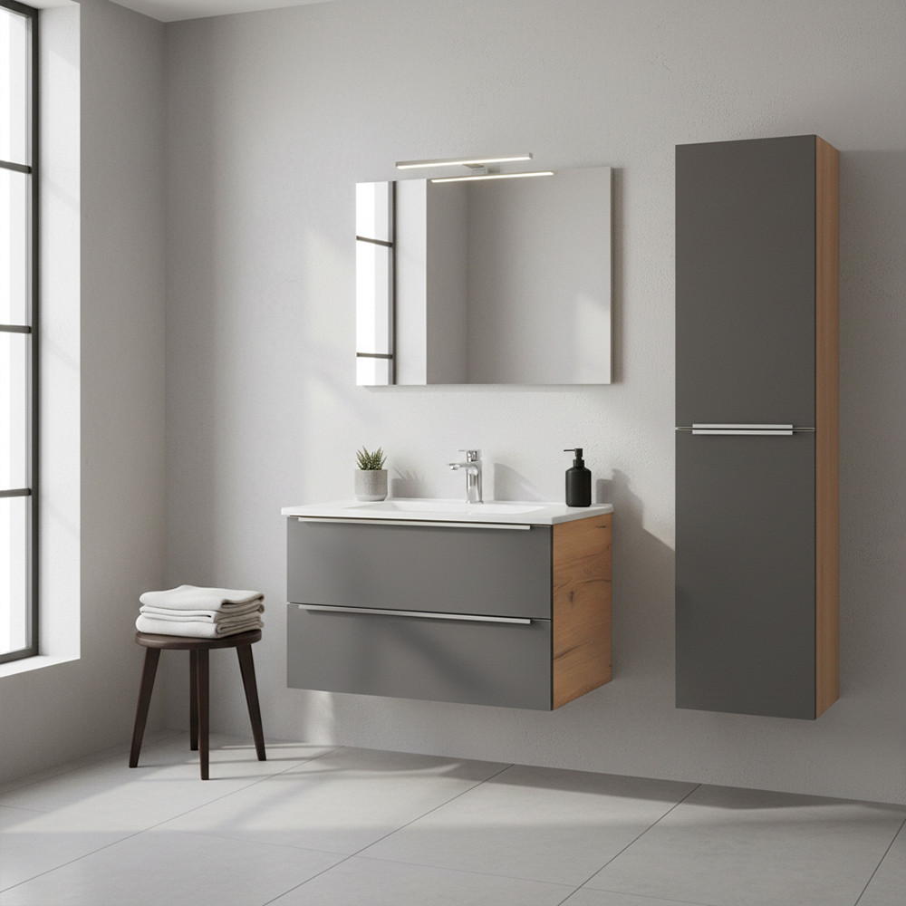 A Vario Trim 35 függesztett oldal szekrény ideális kiegészítője minden modern fürdőszobának. Remek választás, ha extra tárolóhelyre van szükség kompakt méretben a dizájnt és a minőséget is szem előtt tartva. Az tölgy korpusz és antracit front időtlen, letisztult megjelenést biztosít, amely harmonikusan illeszkedik a Vario Trim család további elemeihez.