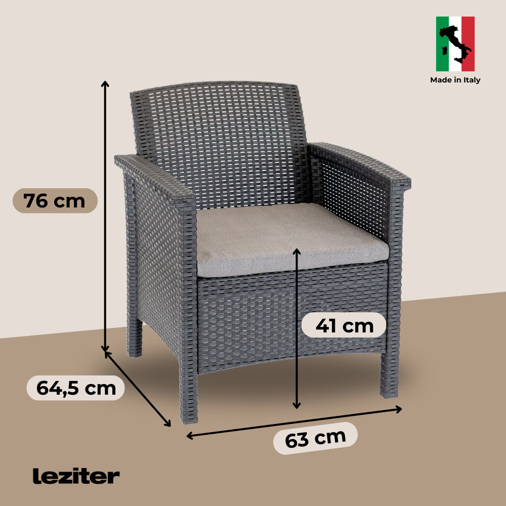 Ha szereted a kényelmet nem csak beltéren, de kültéren is élvezni, akkor ez a te bútorod. Az ergonomikus kialakítás és a puhán párnázott ülések kényelmes ülőhelyeket biztosítanak, míg a rattan hatású felület és a grafit színű megjelenés elegáns és modern hangulatot kölcsönöz a környezetnek.