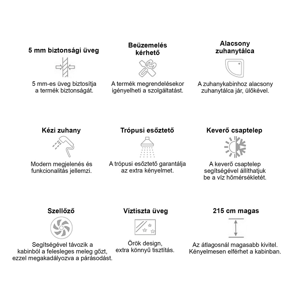 A zuhanykabin 6 hátmasszírozó fúvókával van felszerelve. Az alumínium hátsó panel és a beépített elektronika, kezelőpanel, rádió és hangszórók lehetővé teszik, hogy minden zuhanyzás egy igazi élménnyé váljon. A hátsó és felső hangulatvilágítás, valamint a felső világítás tovább fokozza a relaxációt, miközben a praktikus piperepolc és a lábmasszírozó gondoskodik a maximális kényelemről.