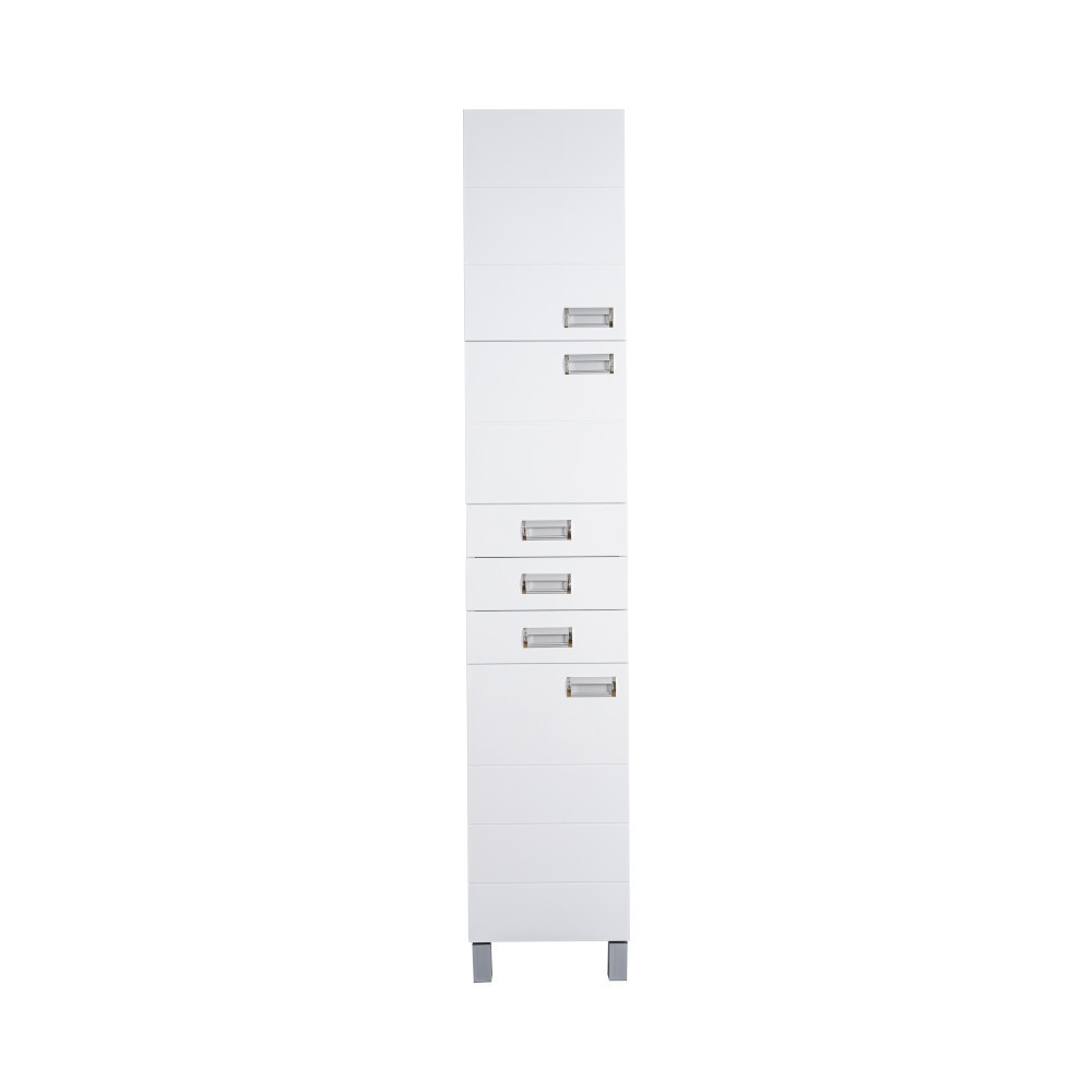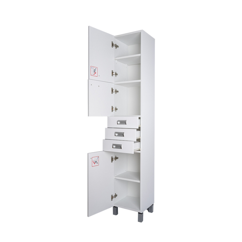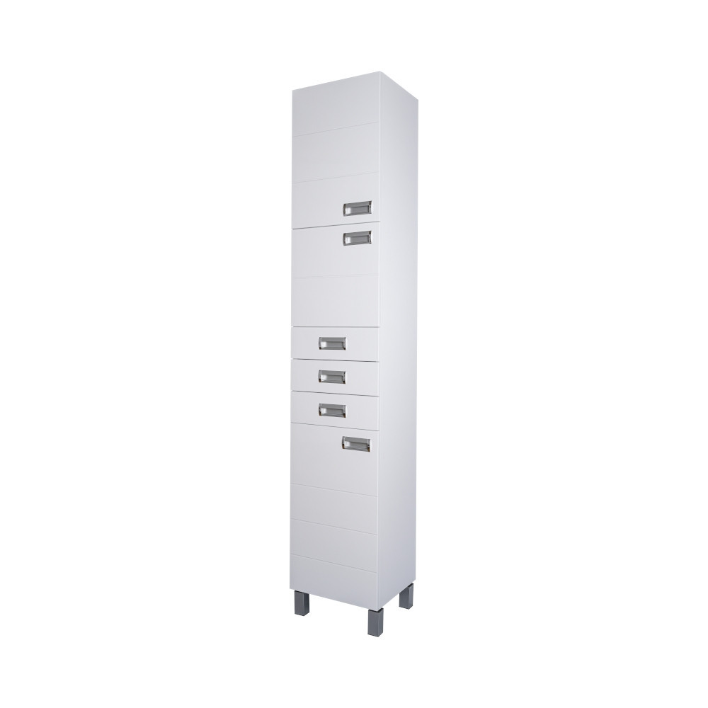 A Szquare állószekrény magas polcos praktikus és hasznos megoldást kínál. Polcaiban tárolhatók a kisebb ruhaneműk, törölközők vagy tisztító és tisztálkodó eszközök és szerek. Ezen felül még 3 fiókkal rendelkezik. Fehér színével szinte mindenhová beilleszkedik és esztétikus környezetet teremt. Rendezze be úgy fürdőszobáját, hogy a végeredmény örömet szerezzen a szemnek és szolgáljon sokáig!