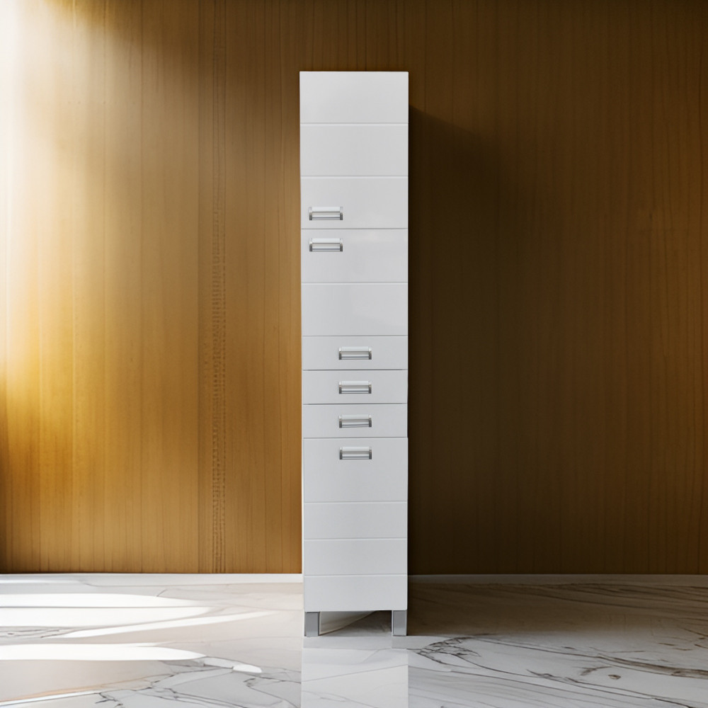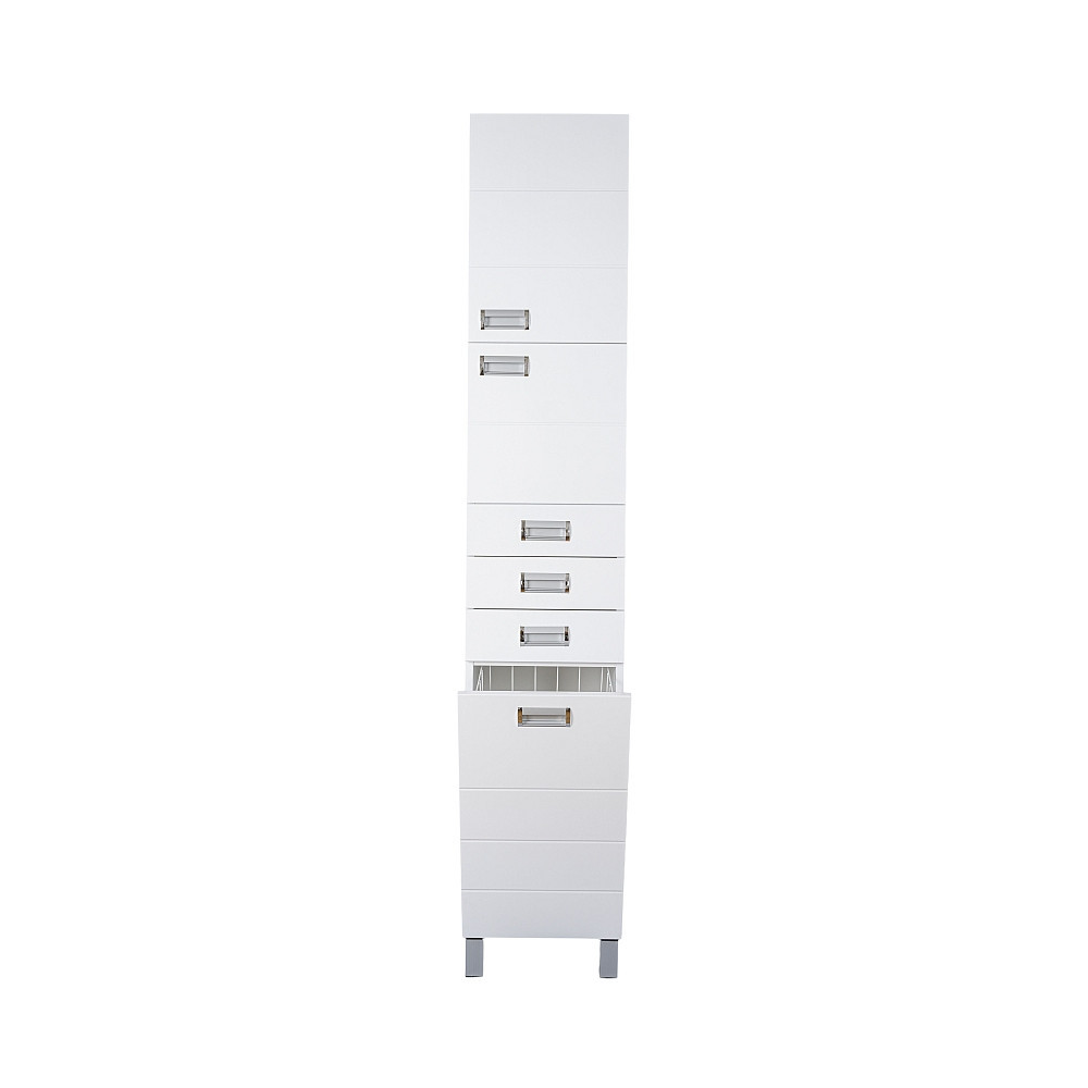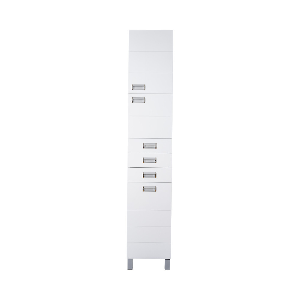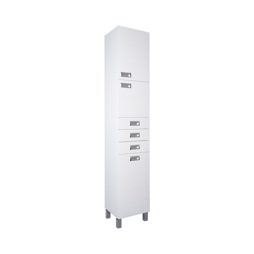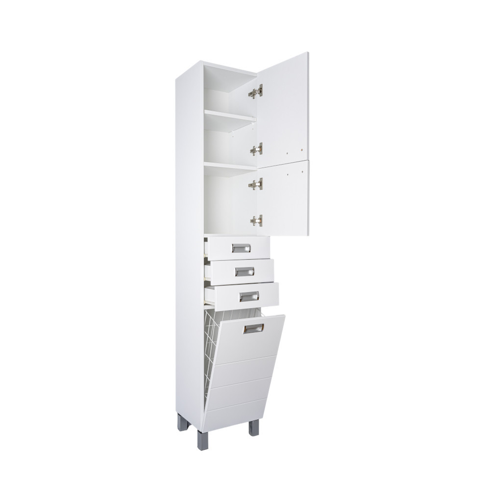 A Szquare állószekrény magas szennyestartós praktikus és hasznos megoldást kínál. Polcaiban tárolhatók a kisebb ruhaneműk, törölközők vagy tisztító és tisztálkodó eszközök és szerek. Ezen felül még 3 fiókkal rendelkezik. A szekrény alsó részében található a szennyestartó kosár. Fehér színével szinte mindenhová beilleszkedik és esztétikus környezetet teremt. Rendezze be úgy fürdőszobáját, hogy a végeredmény örömet szerezzen a szemnek és szolgáljon sokáig!