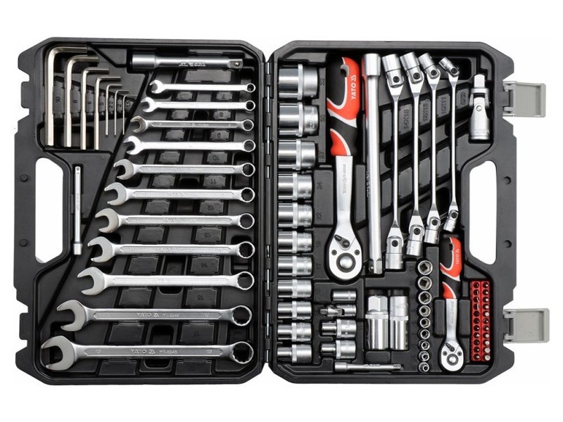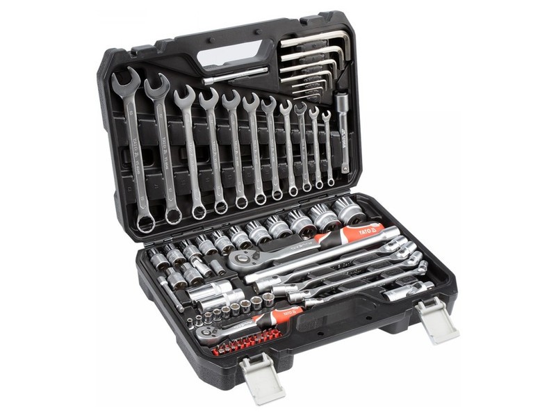 A Yato szerszámkészlet 77 elemet tartalmaz, melyeket egy kényelmes műanyag dobozban helyeztünk el. A szerszámokat precízen készítették anyagokból, biztosítva megbízhatóságukat.A készlet használható összeszerelési munkáknál, mechanikai javításoknál és sok más háztartási vagy műhelymunkánál.A készlet tartalma:Csatlakozó mérete: 1/4′, 1/2’1/4′ csatlakozók (25mm): 4, 5, 6, 7, 8, 9, 10, 11, 12mm1/2′ csatlakozók (38mm): 10, 11, 12, 13, 14, 15, 17, 19, 22, 24mm1/2′ anyák (42mm): 27, 30, 32 mmGyertyahüvelyek: 16, 21 mm1/4′ hosszabbítók: 76, 102 mm1/2′ hosszabbítók: 127, 254 mm72T racsnis kulcs: 1/4’72T racsnis kulcs: 1/2’Kardáncsukló: 1/4’Kardáncsukló: 1/2’Adapter 1/4′ 6-szögű. 1/4’Végek 1/4′:PH0, PH1, PH2, PH3PZ1, PZ2, PZ3lapos 3, 4, 5.5, 7 mmimbusz: 2, 3, 4, 5, 6 mmtorx: T10, T15, T20, T25, T30Adapter 6-szögű. 1/4′ – 1/4 ‘dbLapos végű kulcsok: 7, 8, 9, 10, 11, 12, 13, 14, 15, 17, 19 mmDugókulcsok: 8×9, 10×11, 12×13, 14x15Sarok imbuszkulcsok: 1.5, 2, 2.5, 5, 6, 8, 10 mm Felhasználási figyelmeztetések: A kéziszerszámok használata veszélyes lehet! Mindig használjon személyes védőfelszerelést munka közben. Csak megfelelő, sérülésmentes szerszámokat használjon. Válassza ki a szerszám típusát és méretét a tervezett alkalmazásnak megfelelően. Ne terhelje túl a szerszámokat. Tartsa a szerszámokat távol a gyerekektől. Gondosan használja a szerszámokat.