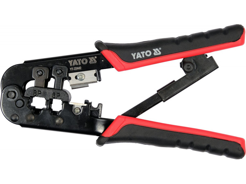 YT-22442 fogó ráccsal a telefon és hálózati végződések préseléséhez. A fogó szénacélból készült, amelyet oxidációs folyamatnak vetettek alá, így védelmet nyújt a korrózió ellen. Két komponensű műanyag fogantyúk. A keményebb PP komponens szorosan tapad a testhez, míg a TPR külső rész kellemes tapintású és csúszásgátló tulajdonságokkal rendelkeziklehetőség a telefon végződések RJ11, RJ12 préseléséreképes az RJ45 hálózati kábelek végződéseinek préseléséreképes gyorsan lehúzni az izolációt a CAT kábeleknek jellemző átmérővelképes a kábel vágására Használati figyelmeztetések: Figyelem! Mindig használjon személyes védőfelszerelést munka közben.